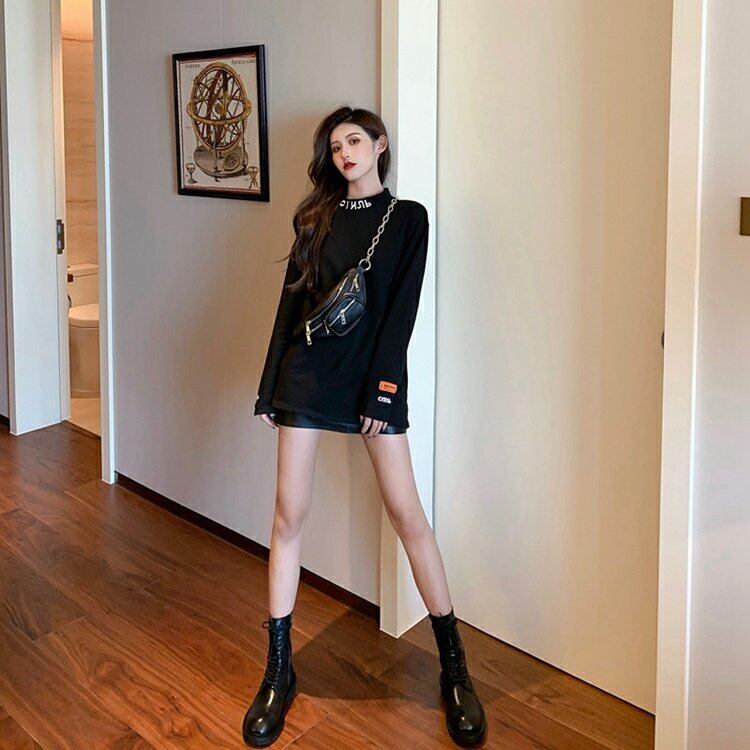 レディースロングスリーブボトムスシャツ2020年春に新しい流行のルーズで薄いミドル丈の黒のTシャツトップ 香港の味26104432335