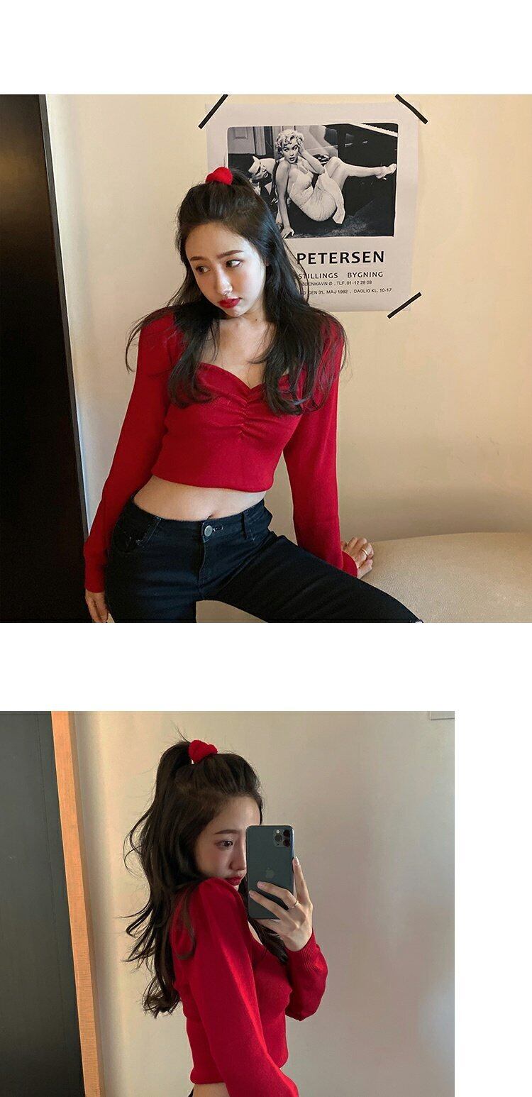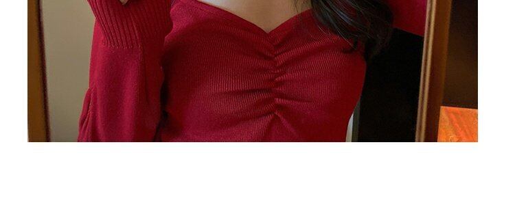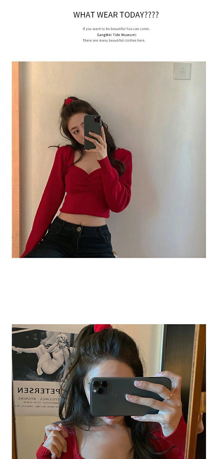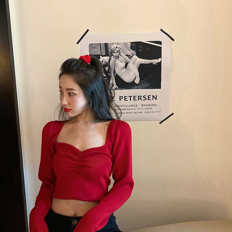 フェミニンなスクエアネックの赤いシャツショートニットセーター春フレンチレトロタイトフィットスリムロングスリーブボトムスシャツ 香港の味36259645944