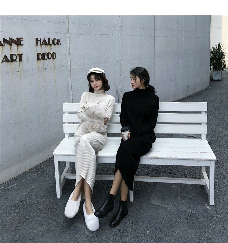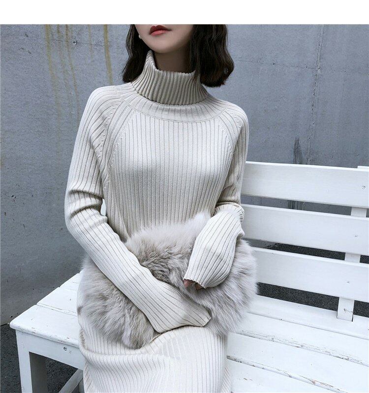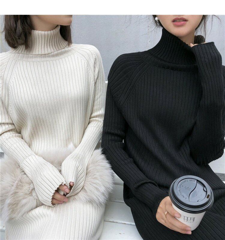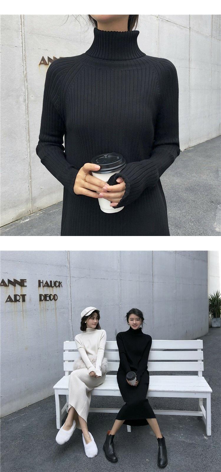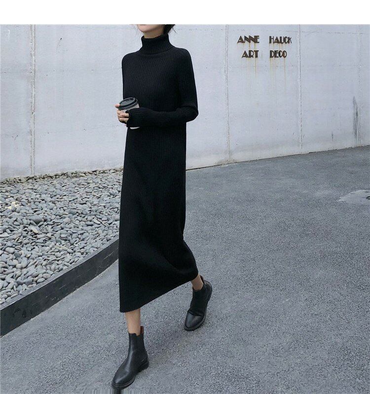 ニットドレスレディース秋と冬2019新しい緩い気質ミドル丈スカートレトロハイネック長袖ボトムススカート 香港の味6935798241