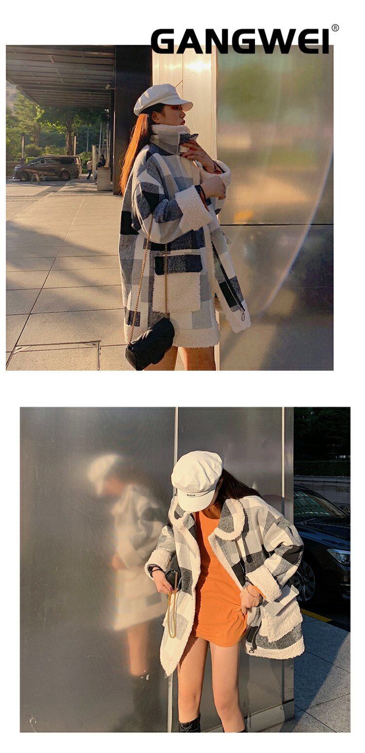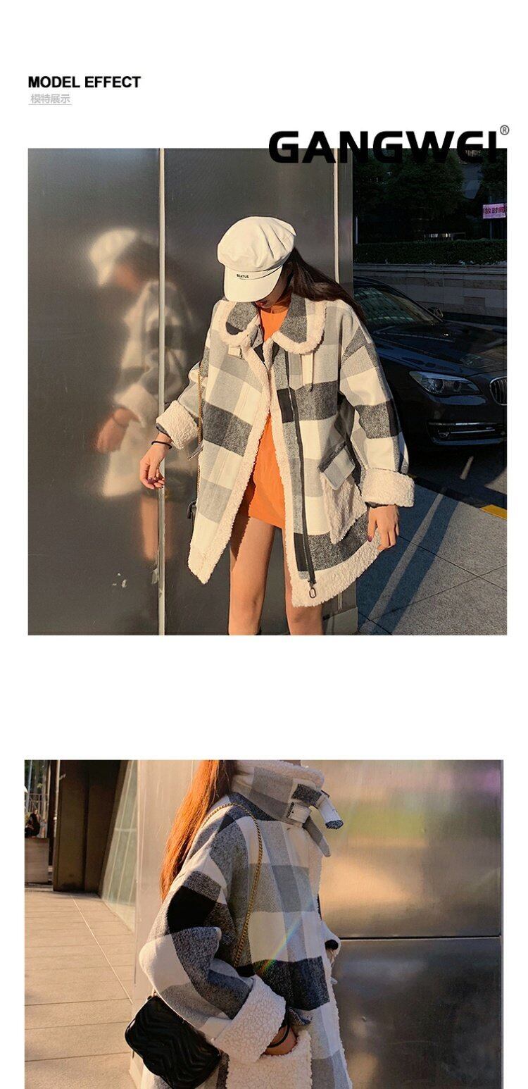 チェック柄ステッチイミテーションラムウールコートレディースミドル丈2019人気ルーズ秋冬新作厚手のウールコート 香港の味92862020911