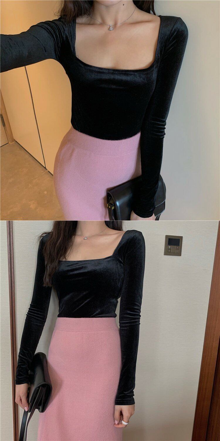 スクエアネックベルベット長袖ウエスタンスタイルTシャツ女性新秋冬スリムスリミングボトミングシャツ新2019 香港の味671786438