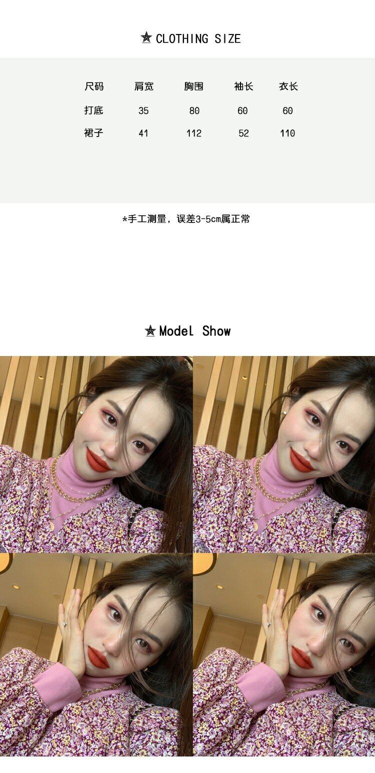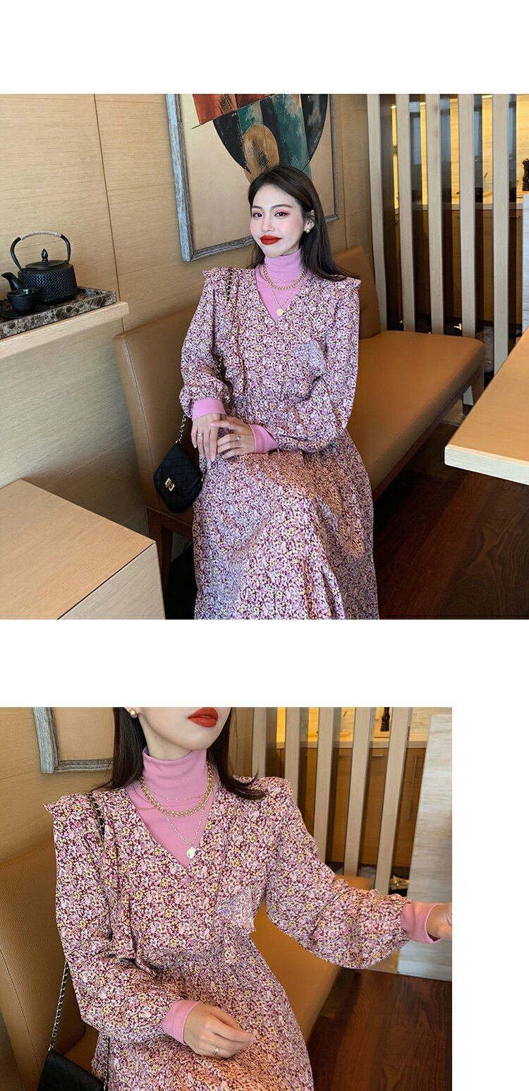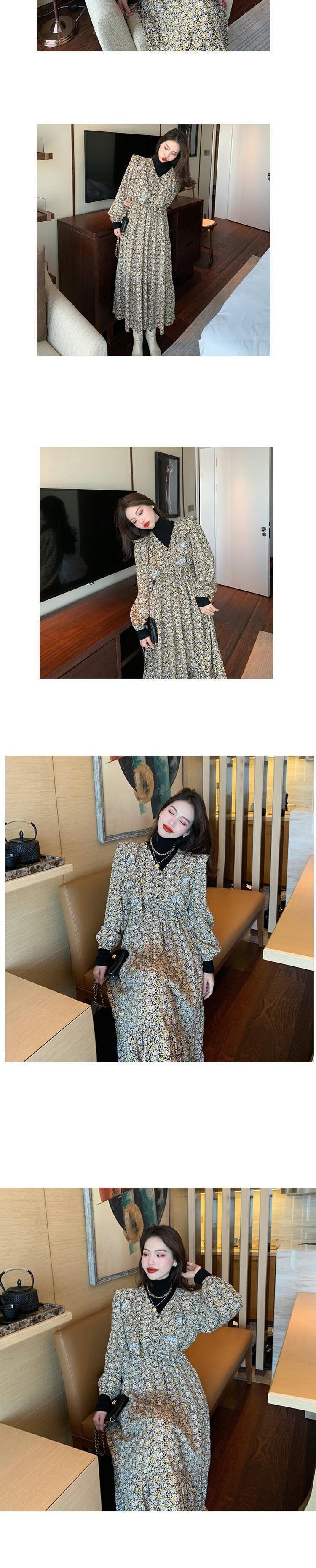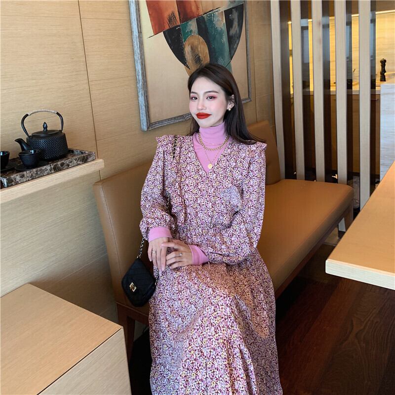 Vネック人気花柄ワンピース女性気質ミドル丈スカート2020新作長袖インナーベーススカート春ドレス 香港の味94252015289