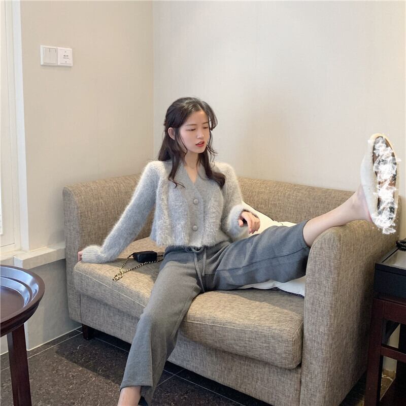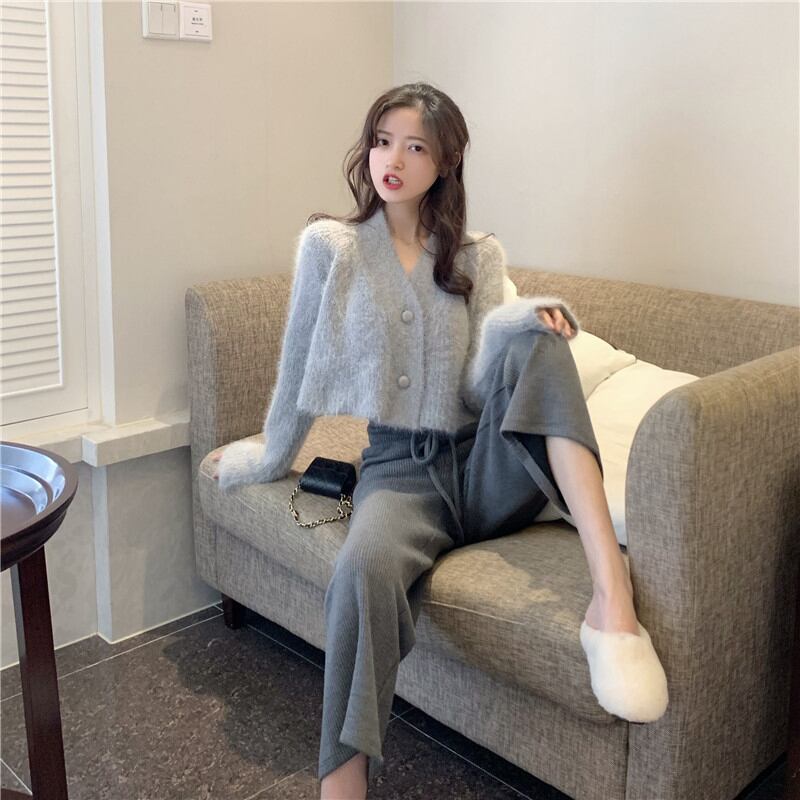 色:グレーのワイドレッグパンツ,グレーのカーディガン
