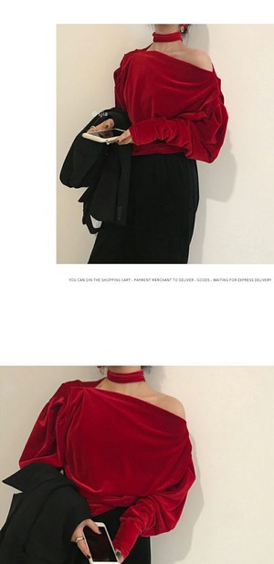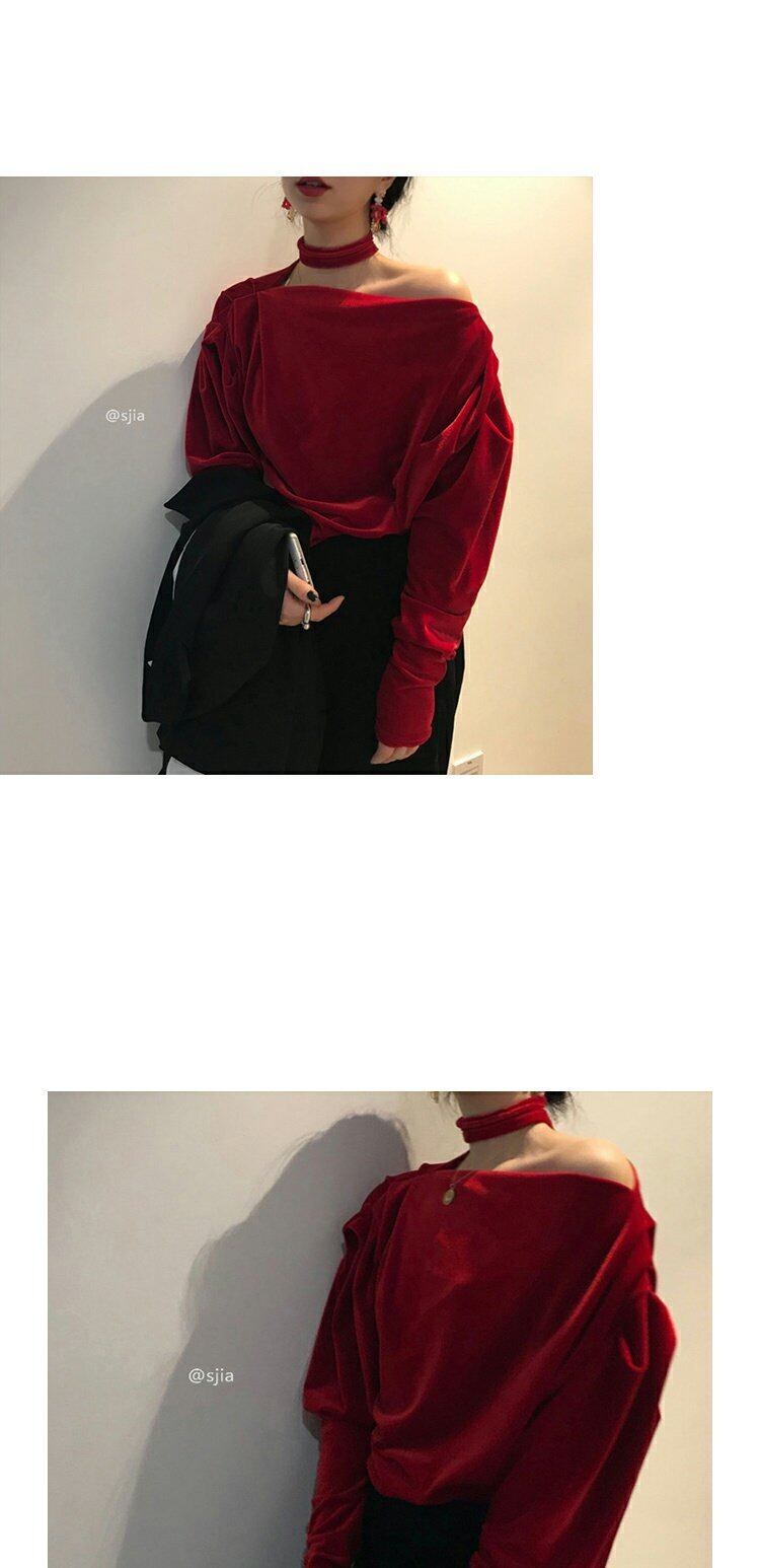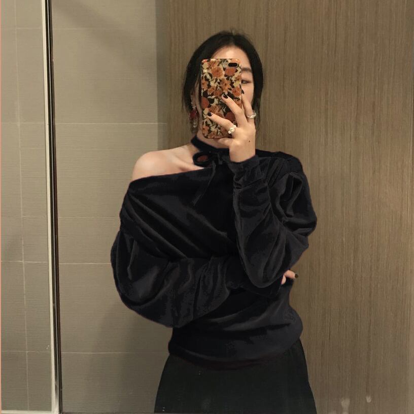 シャツ女性デザインセンスニッチ2019新しいシックなレトロなボトミングシャツワンショルダーベルベット長袖トップ 香港の味75475914133