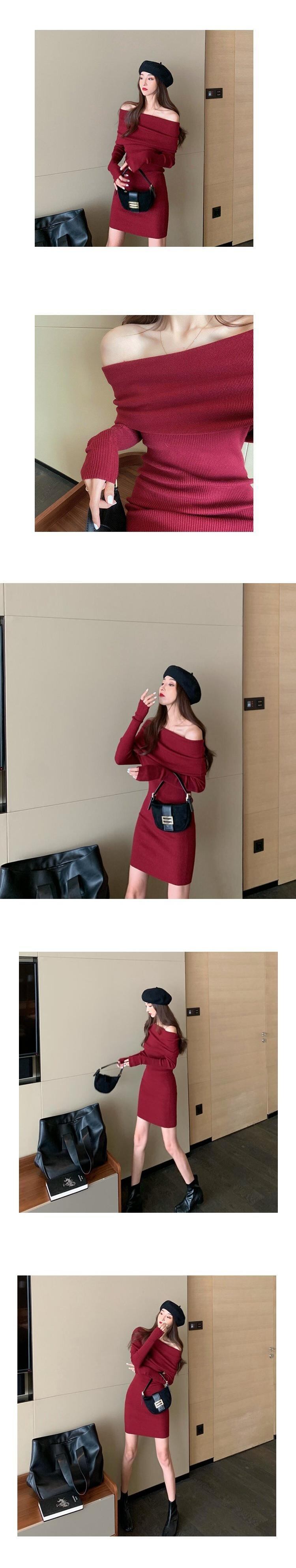 ワンラインネックネットレッド長袖ニットスカート新春スリムバッグヒップドレス2020ストラップレスボトミングスカートメス 香港の味90058996226