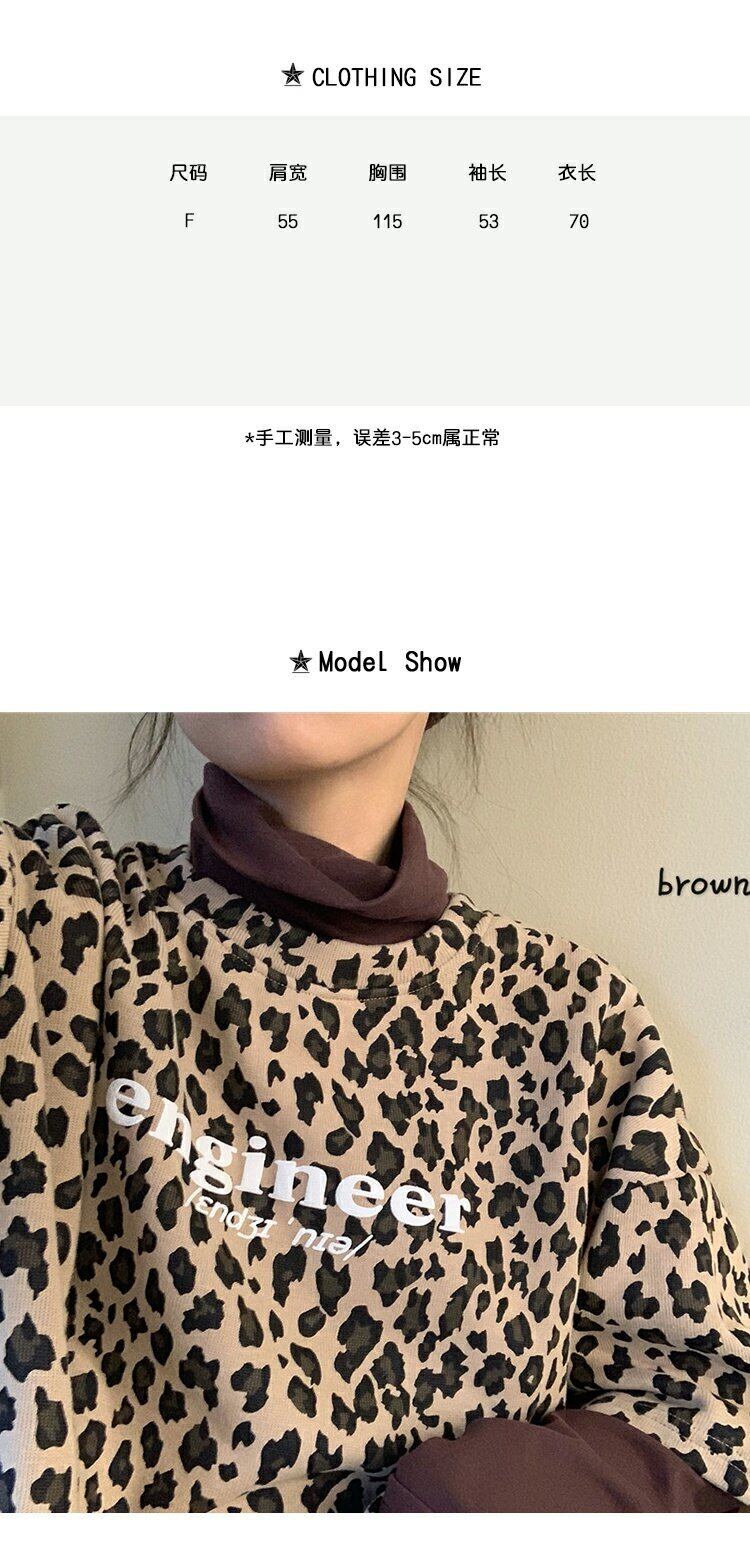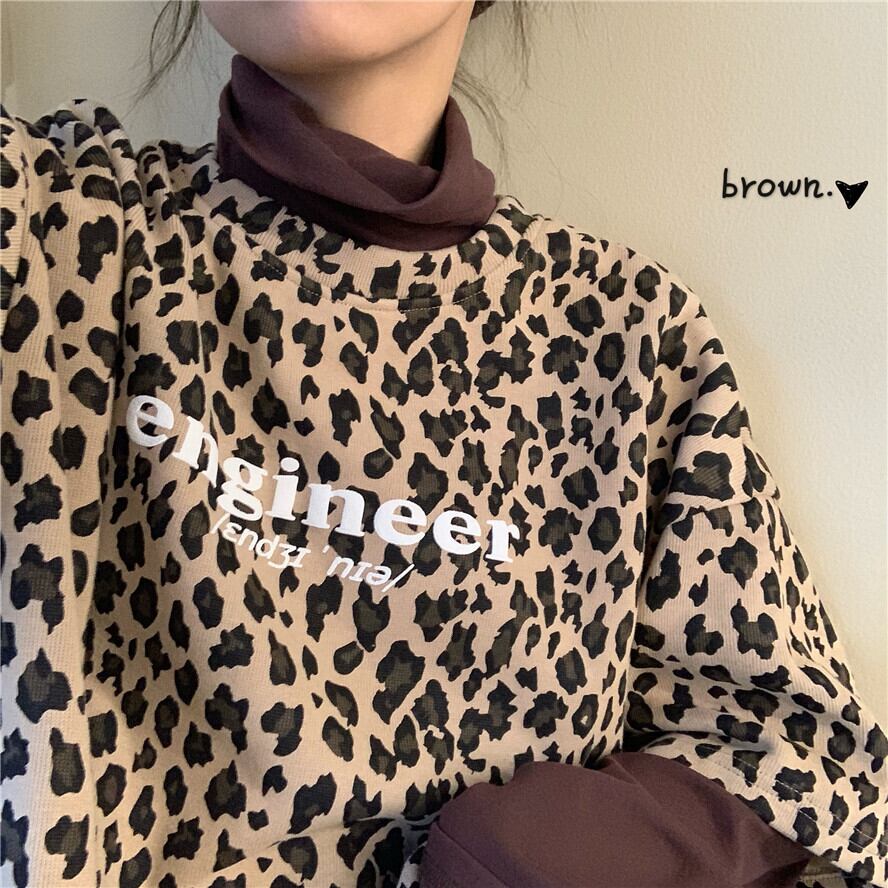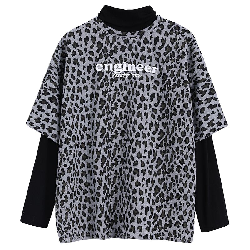2020年新作スプライシング長袖ハイネックヒョウ柄Tシャツレディースフェイクツーピースインナーボトミングシャツスプリングルーズトップ 香港の味99991296487