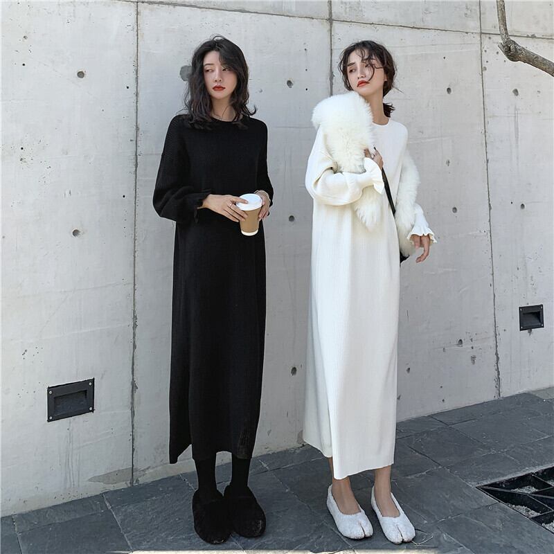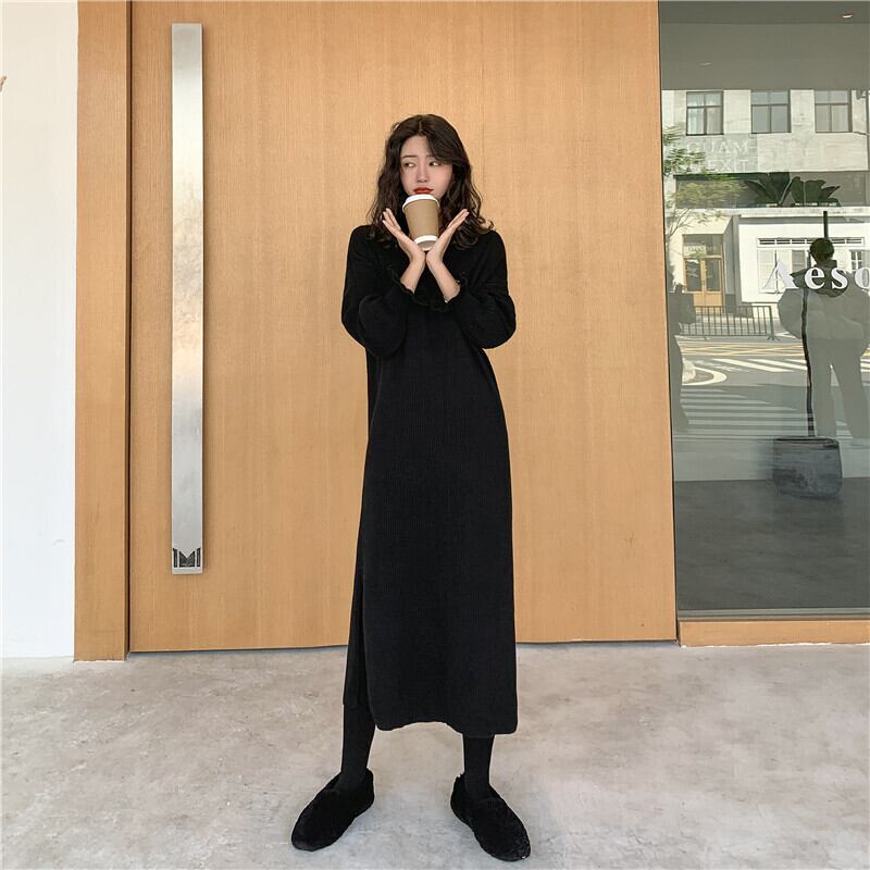 スプリットハイウエストニットドレスレディース長袖膝上ルーズミドル丈スカート新作2019秋冬ベーススカート 香港の味89807074465