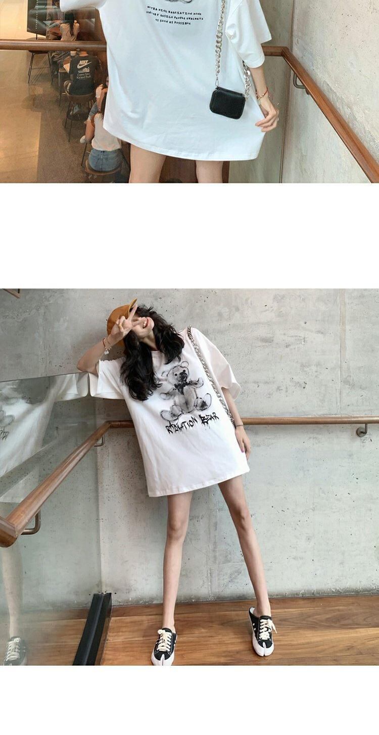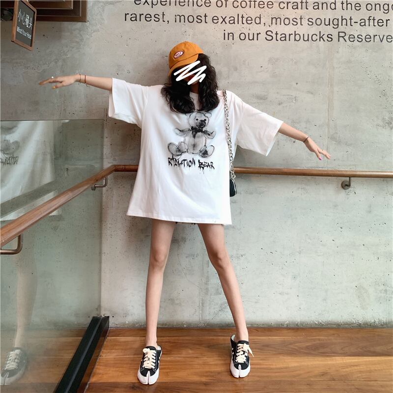 ベアプリントTシャツ女性インタイドワイルドサマーネットレッドルーズミドル丈ボトムス欠品半袖ホワイトトップス 香港の味2588683971