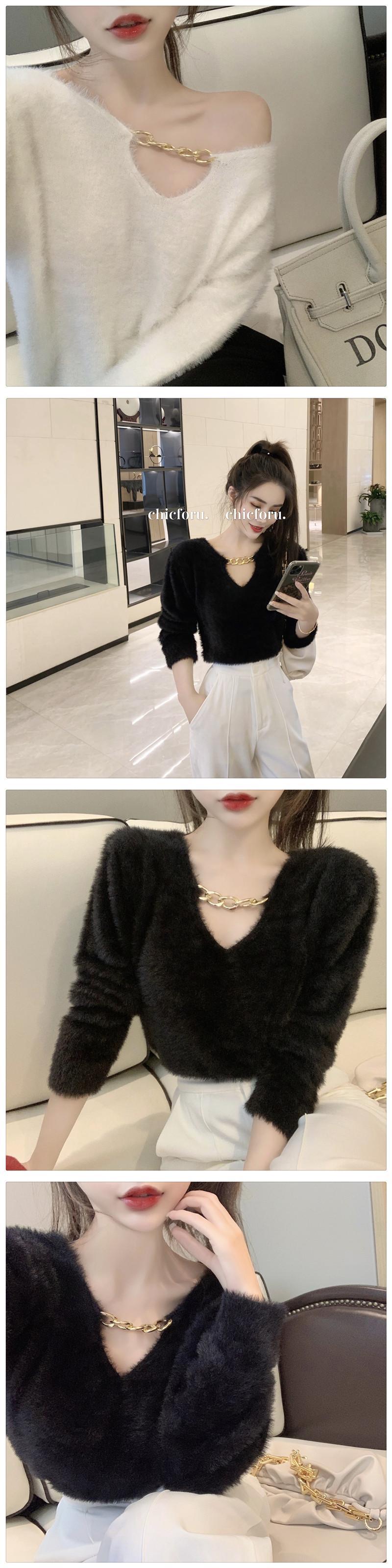 セーター レディースルーズVネックファーコート スプリングショートスタイルニット 春物 チェーン 香港の味46680218555