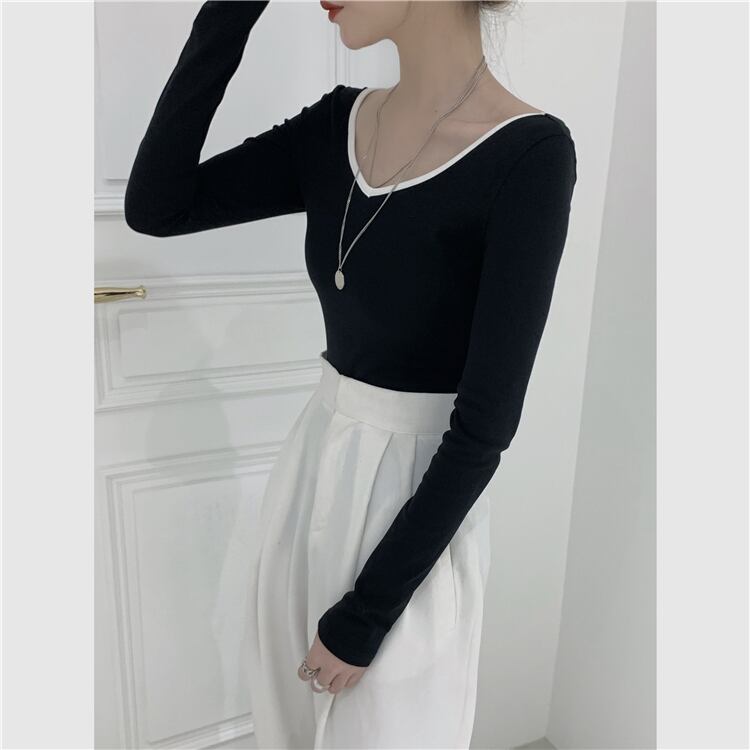 Tシャツ シャツ スプリングショートカラーVネックスリムブラックトップス ロング 春物 香港の味56636682014