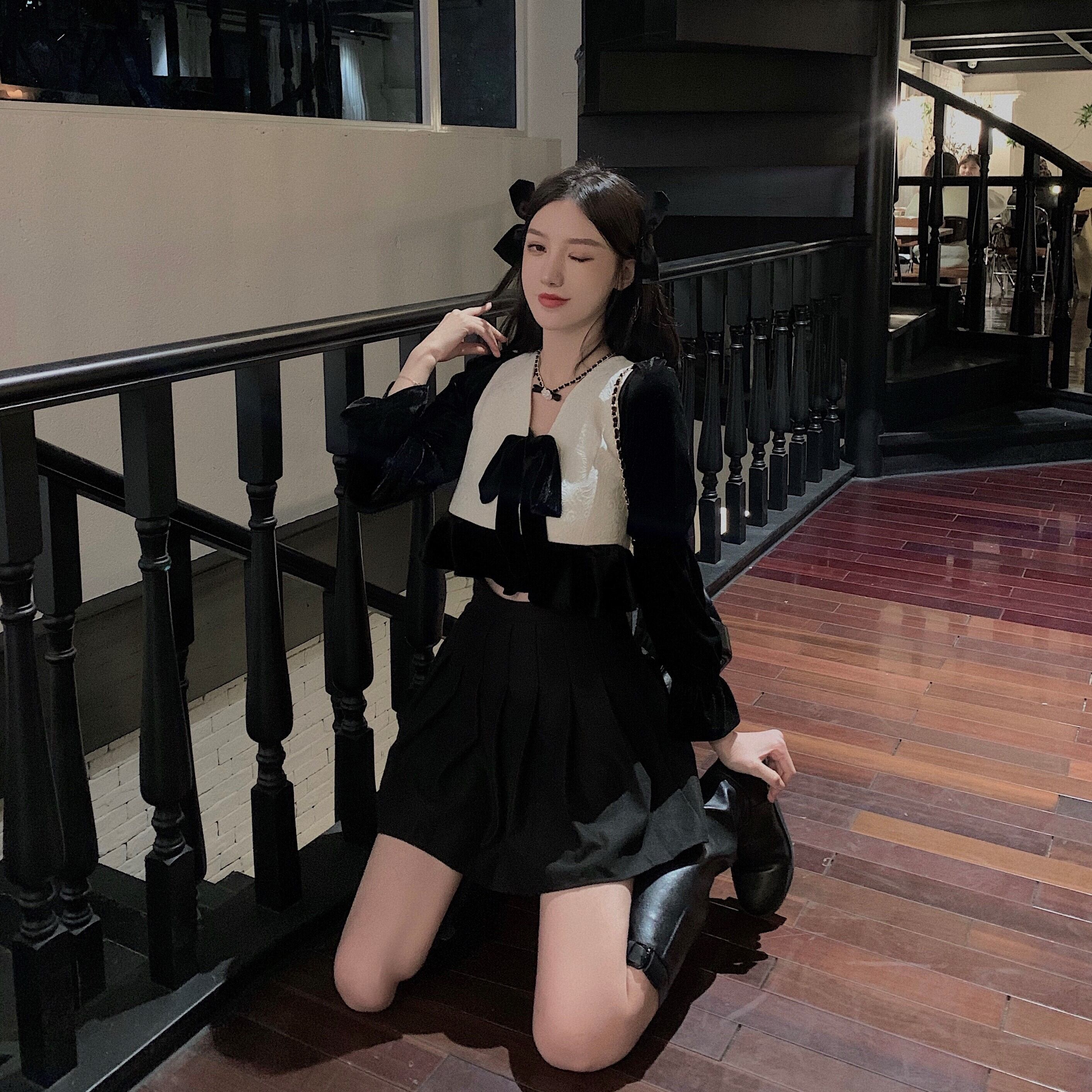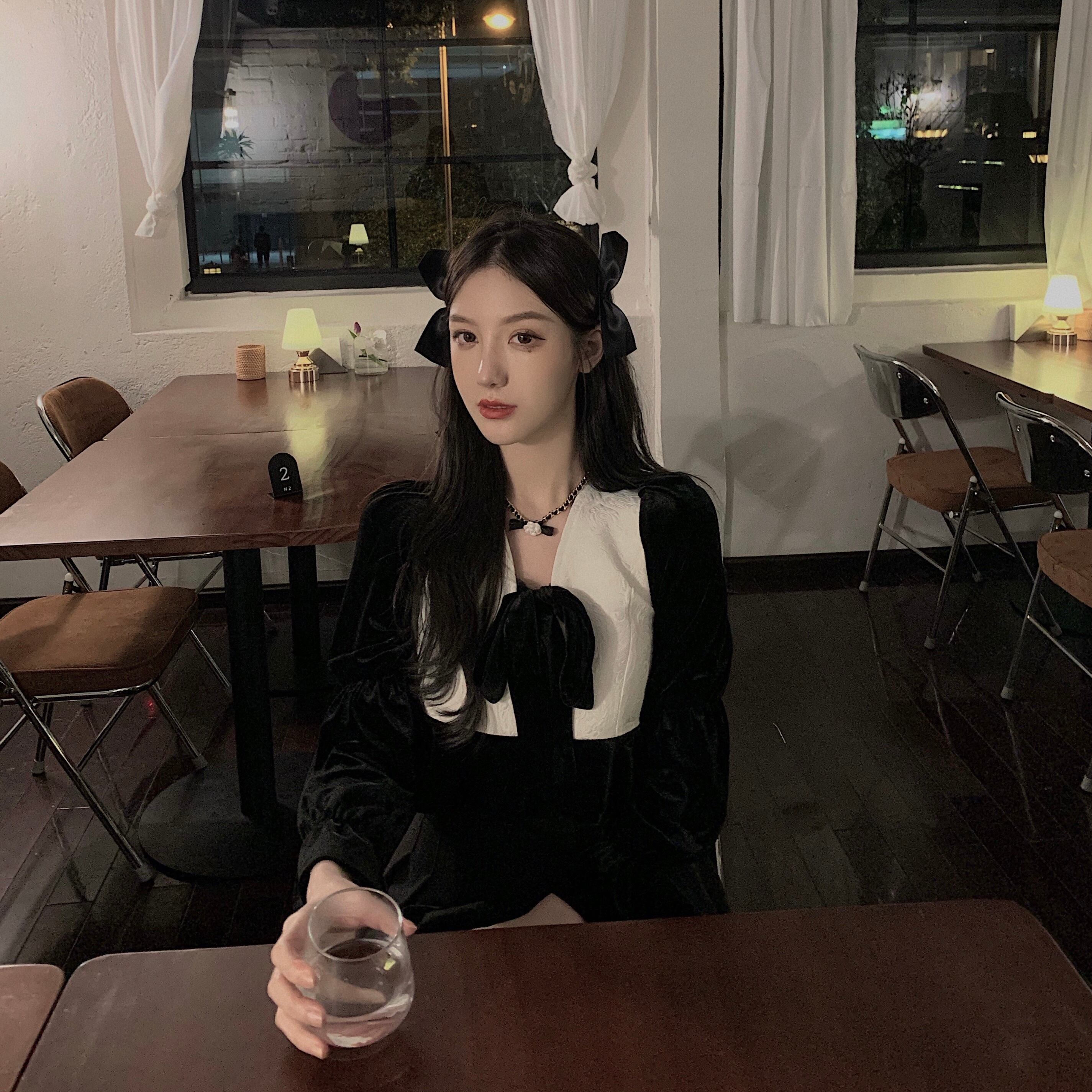 ブラックシャツ レディーススタンダードカラーリボンスプリングショートベルベットトップス ロング レトロ 春物 ステッチ 香港の味35173510894