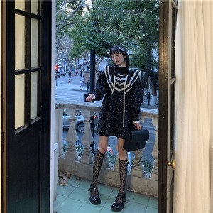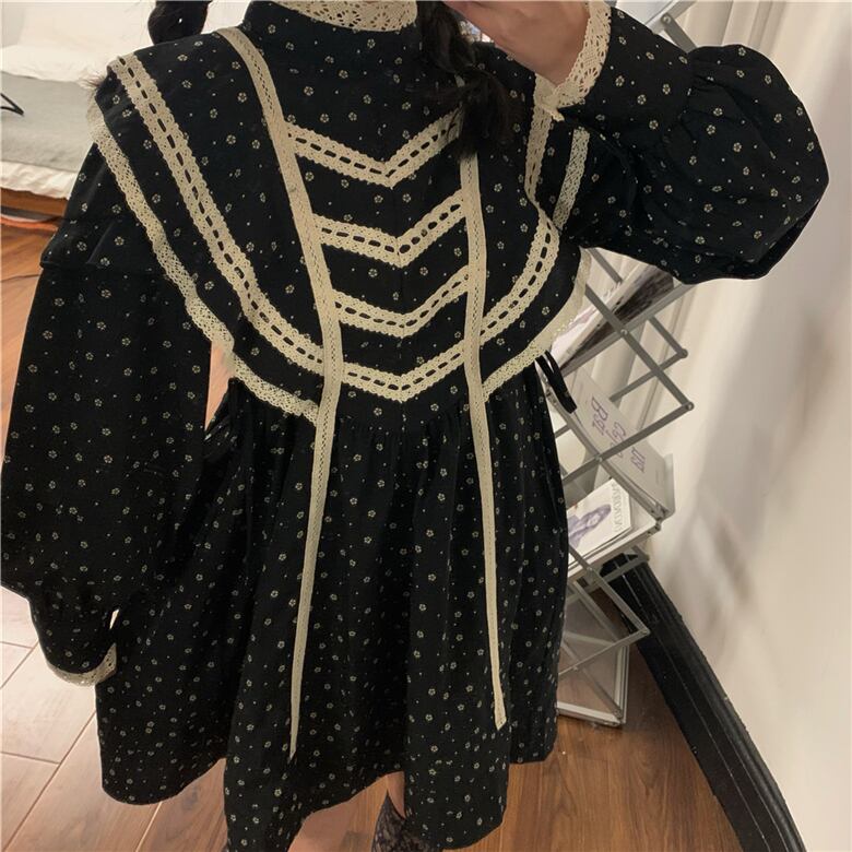 フローラルスカート スタンダードカラーブラックスリムショートスプリングドレス レトロ 春物 花柄 香港の味11174388494