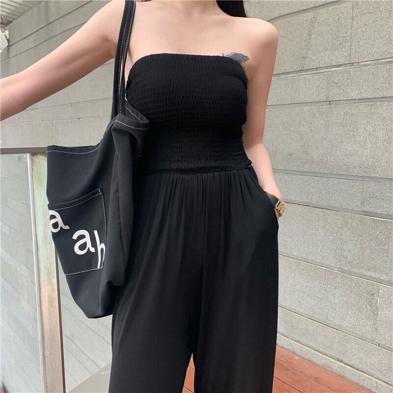 ジャンプスーツ オールインワン レディースサマーハイウェストウェストルーズワイドレッグパンツ カジュアルブラック 夏物 ワイドパンツ 香港の味71696237702
