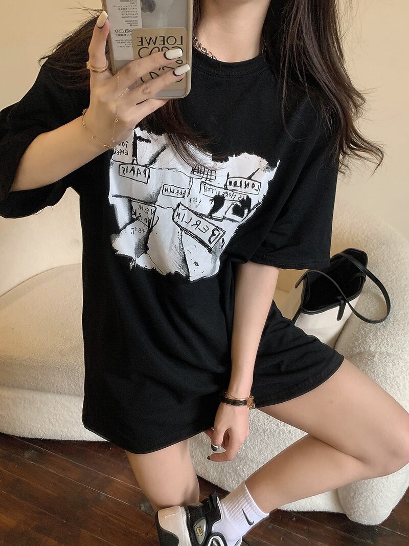 Tシャツ レディースサマースタンダードプリント柄ラウンドネックルーズホワイトトップス レトロ 夏物 Oネック 香港の味75411866957
