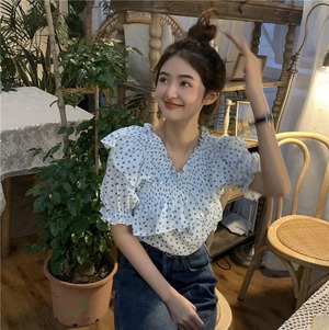 水玉シャツ Vネックルーズスタイルサマースリーブシフォントップス レディース 夏物 香港の味54485348537