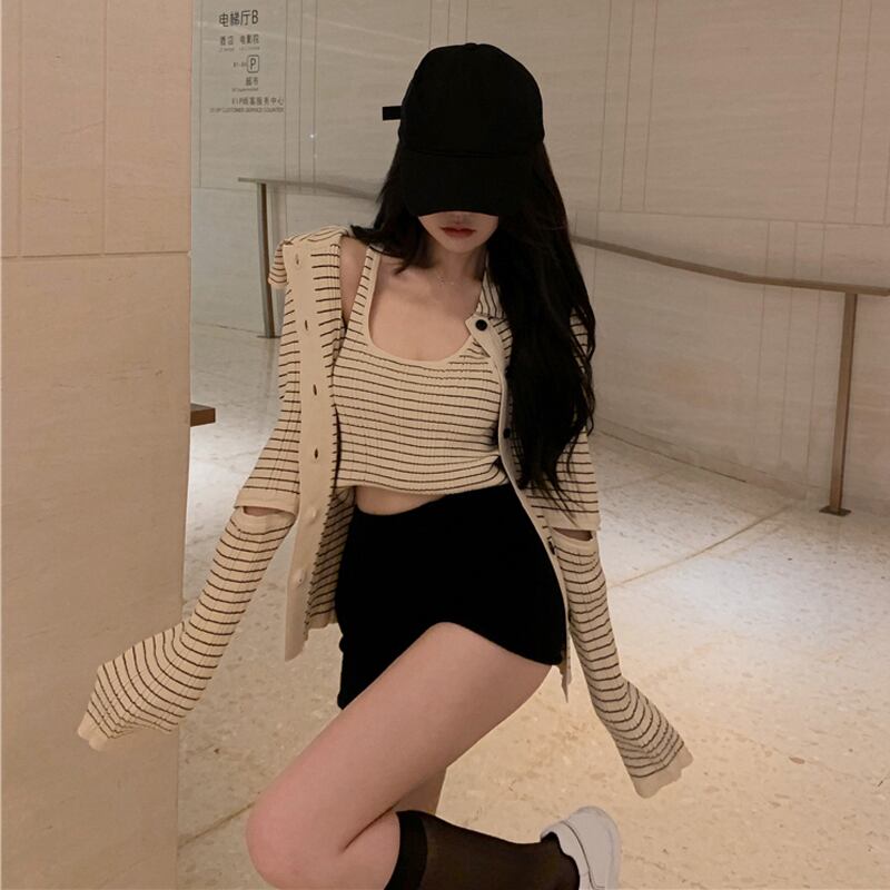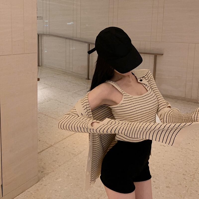 ストライプセーター 薄手スタイルシャツ サマーショートカーディガンスタンダードジャケット レトロ 夏物 香港の味28709244580