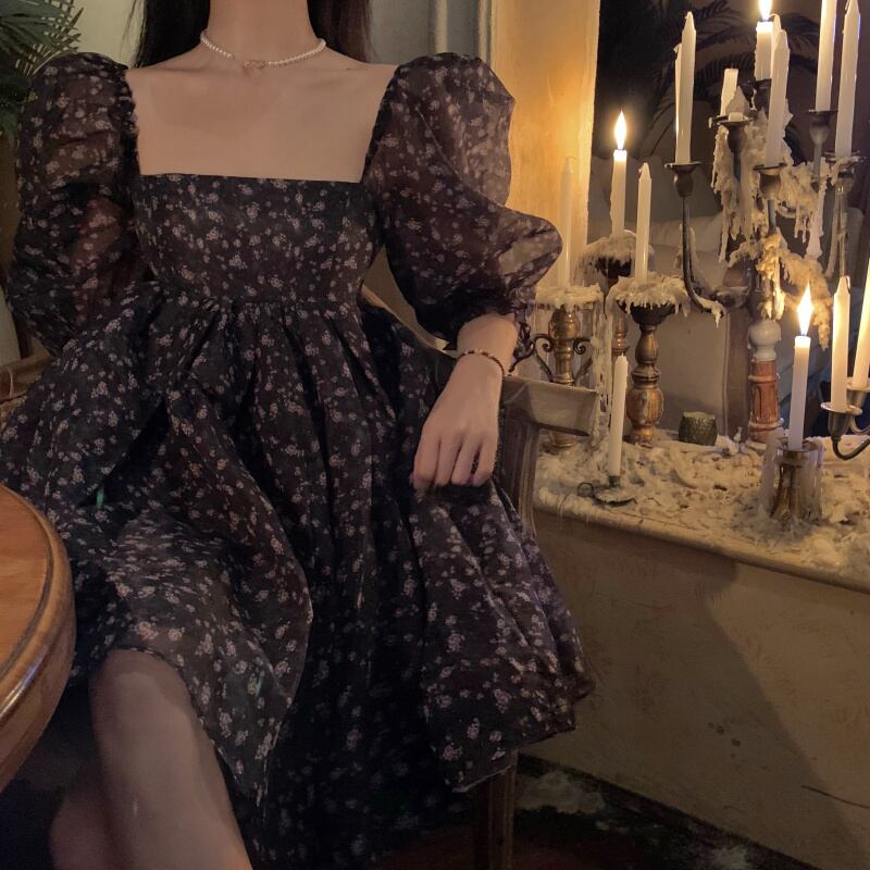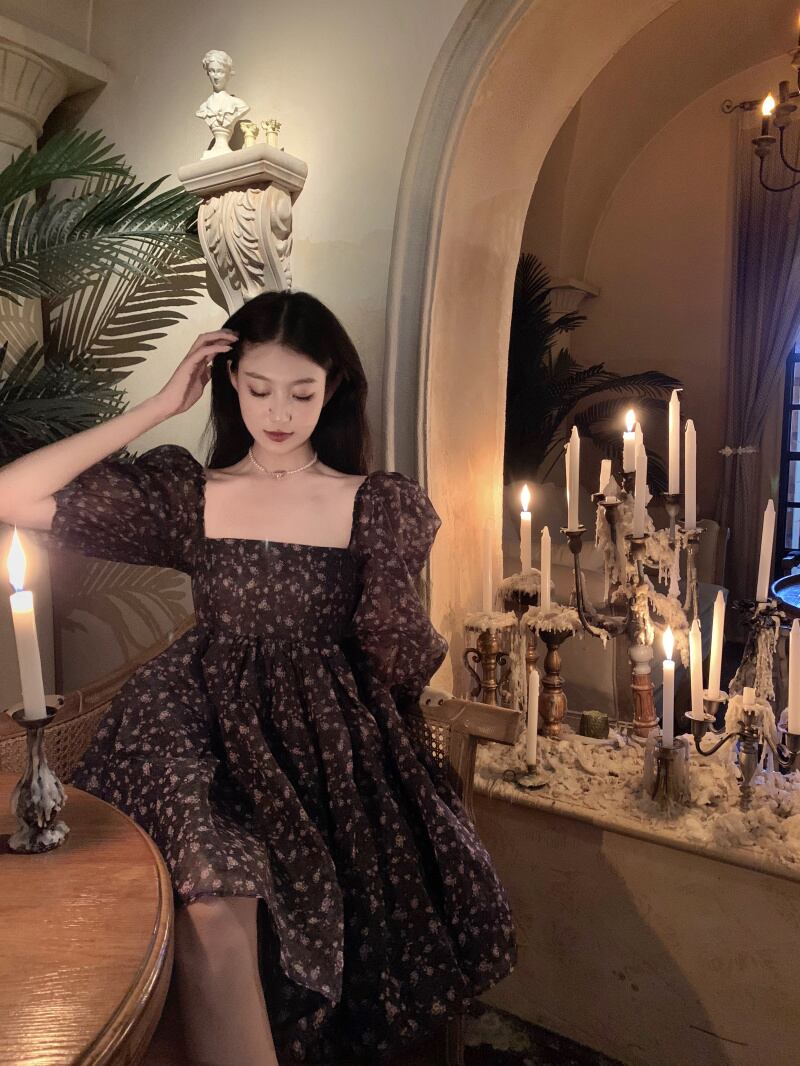 ブラックフローラルドレス スタンダードスカート サマーカラースリーブシフォン レトロ 大人ガーリー スウィート キュート カジュアル 夏物 花柄 スクウェア 香港の味56621087301