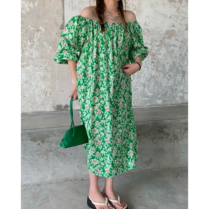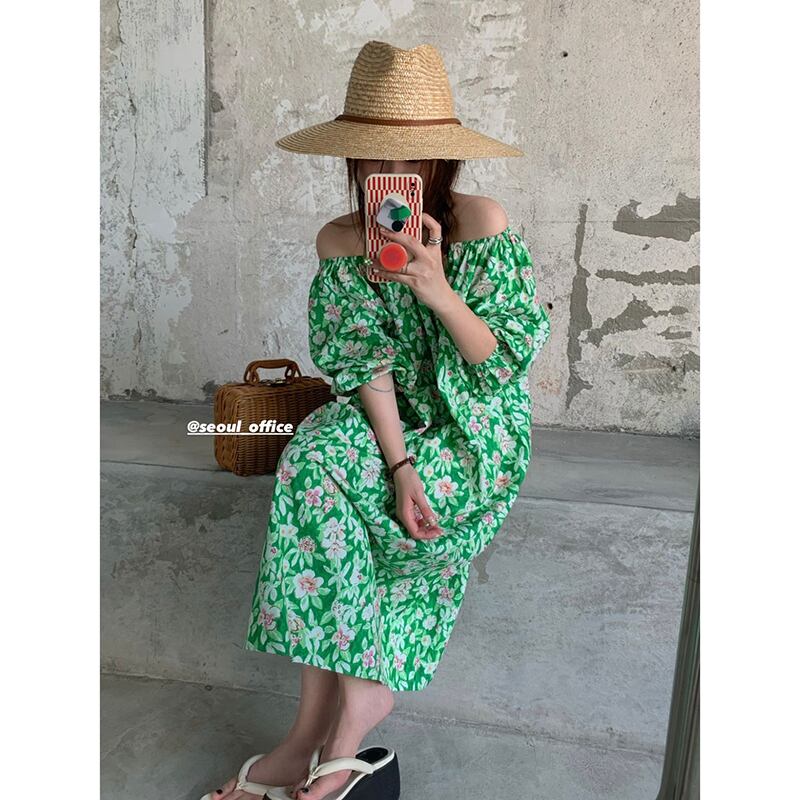 フローラルグリーンドレス サマースタイルルーズ薄手スカート 夏物 花柄 香港の味8320679694