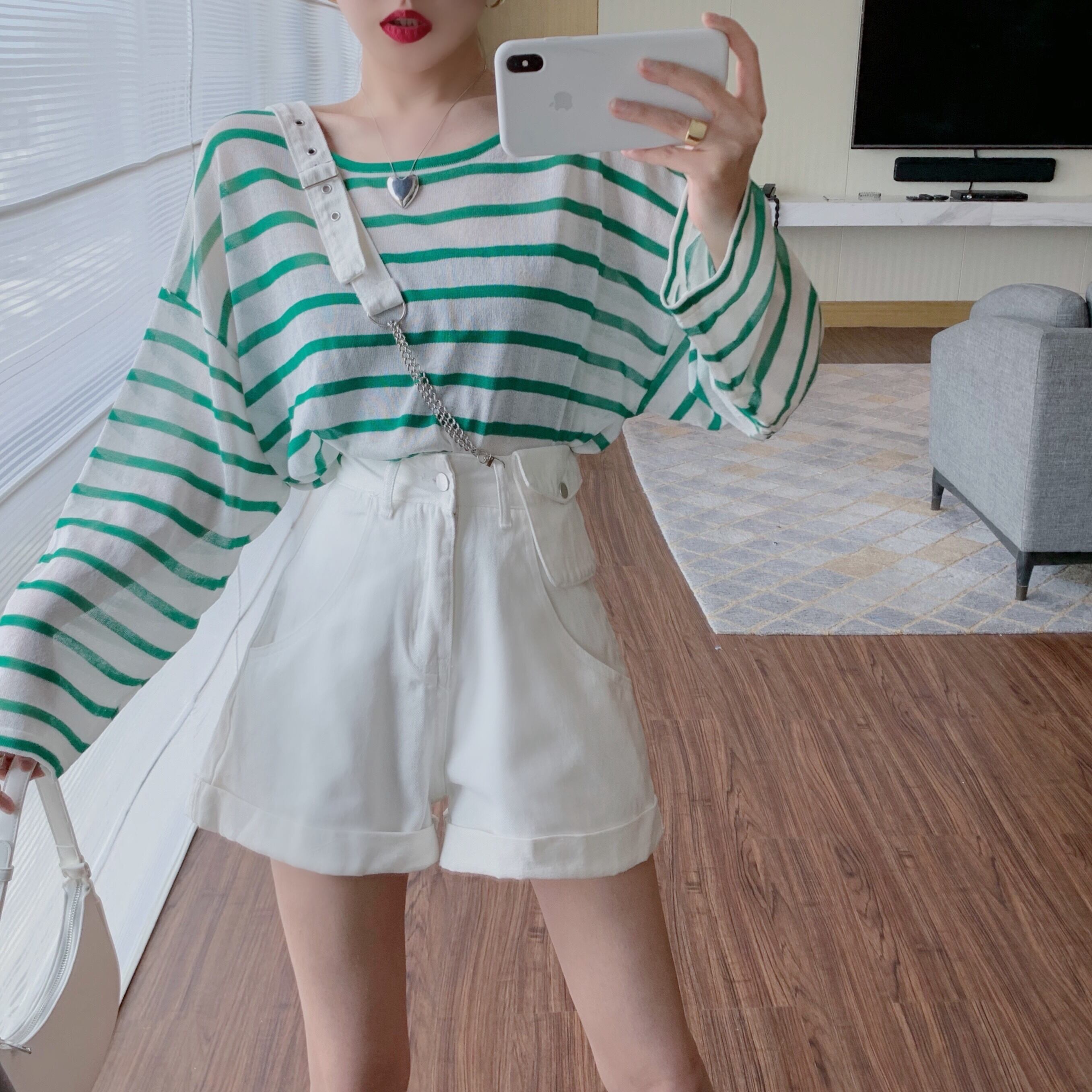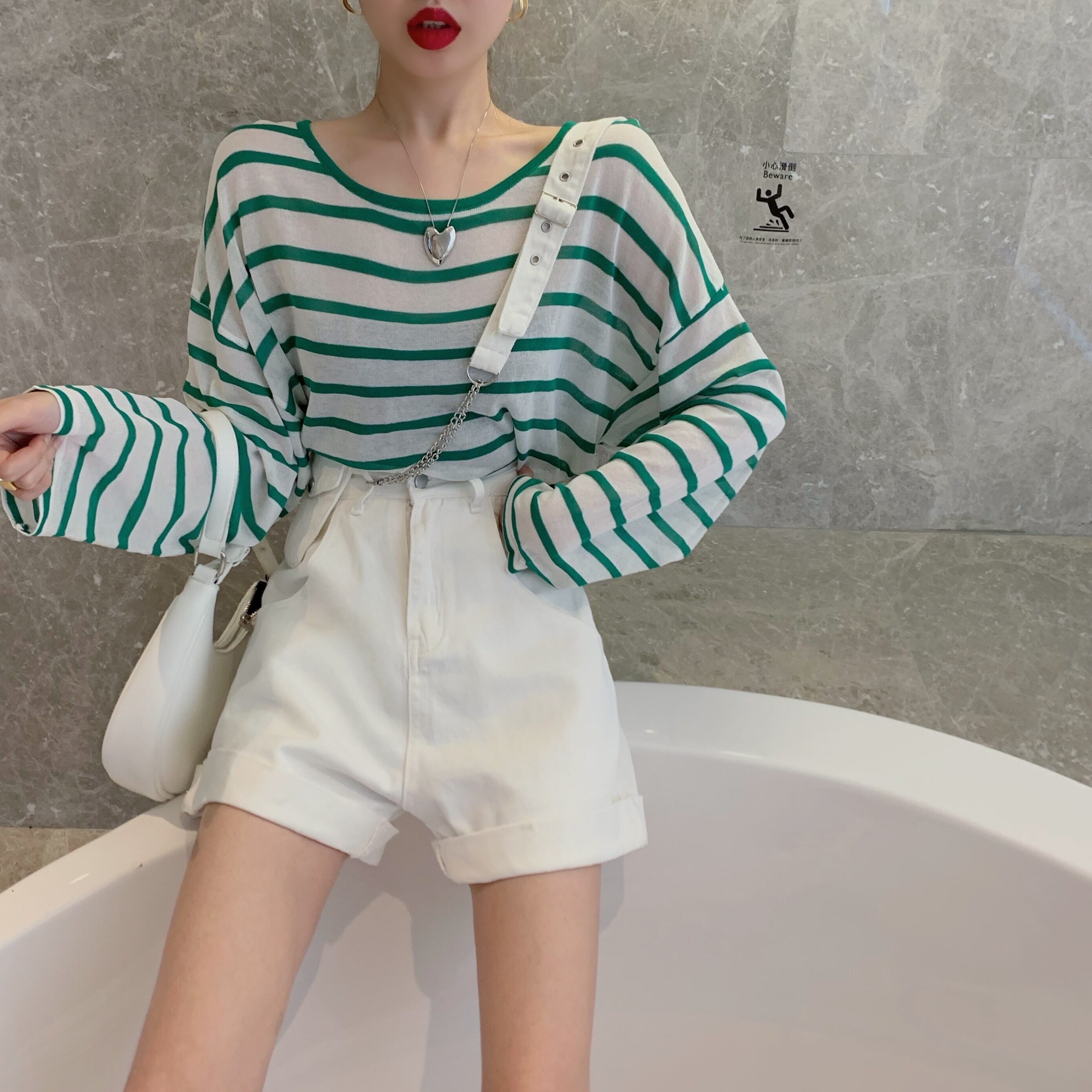 色:グリーンストライプ(日焼け防止ニット),ブルーストライプ(日焼け防止ニット),ホワイト(ジーンズ)
