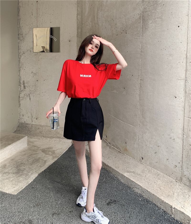 Tシャツ サマープリントラウンドネックカジュアルルーズ薄手レッドトップス 夏物 Oネック 香港の味81166308281