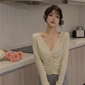 Tシャツ シャツ ギャザーショートサマースタイルスリム薄手ハイウェストVネック ロング 夏物 香港の味23207505582