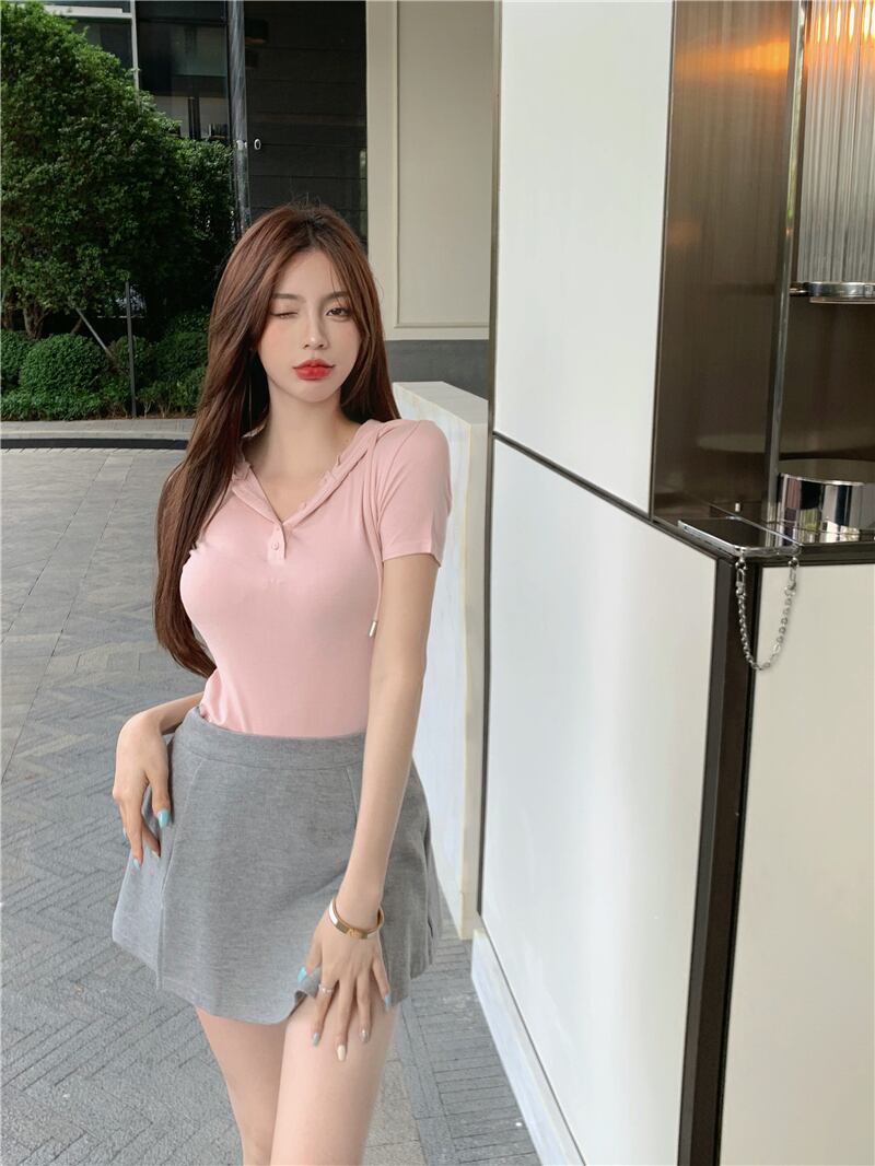 Tシャツ レディースカジュアルサマーカラーフードトップス ピンク 夏物 香港の味23636964758