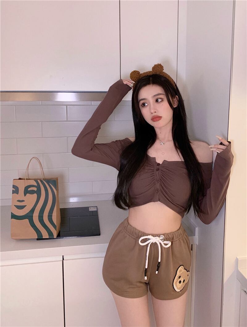 色:ホワイトショーツ,ホワイトトップ,黒のショートパンツ,黄色のシャツ,コーヒートップ,ブラウンショートパンツ