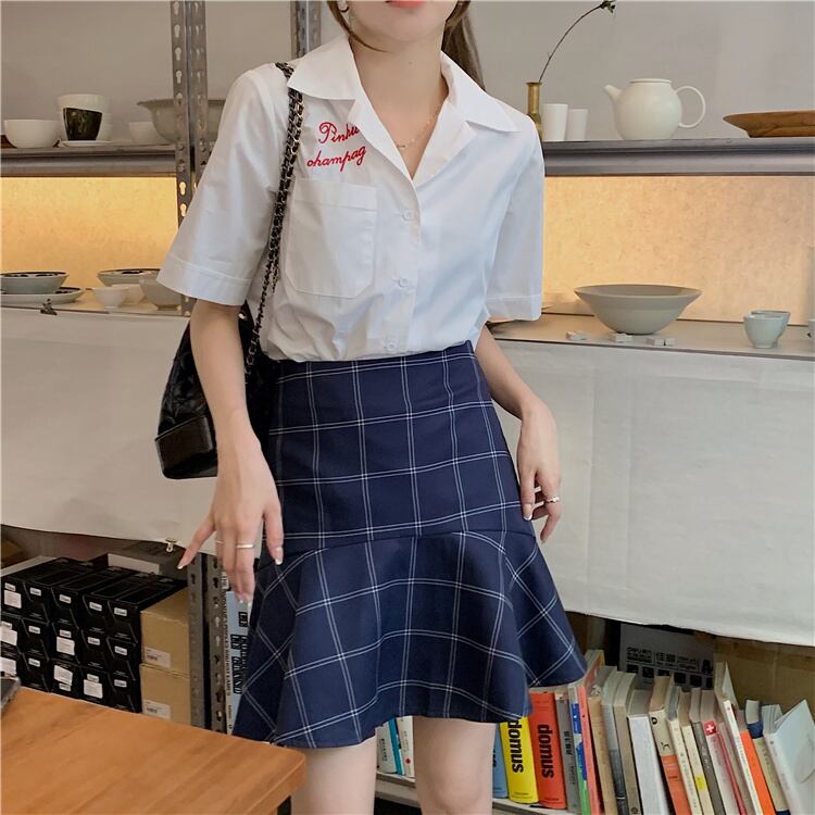ルーズプリントシャツ 格子柄スカート 香港の味8564348477