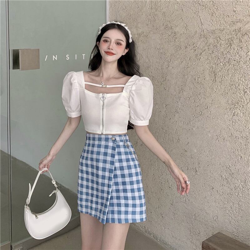 スリーブトップス カラージッパーショートサマーホワイトシャツ 大人ガーリー スウィート キュート カジュアル 夏物 スクウェア 香港の味25114926848