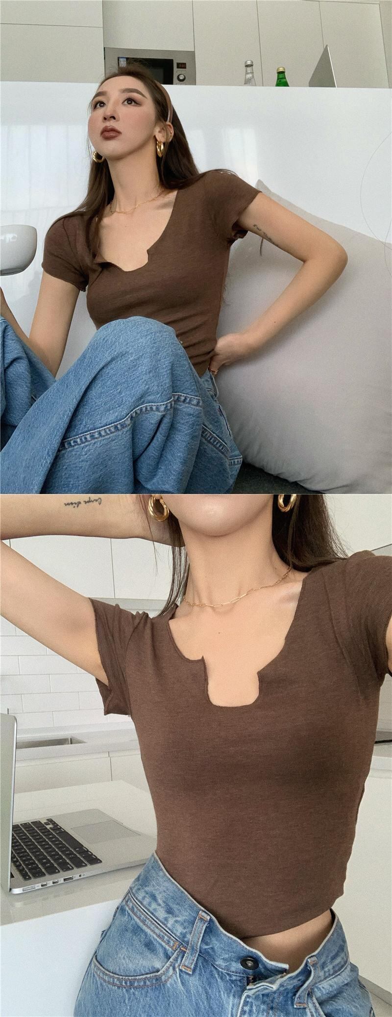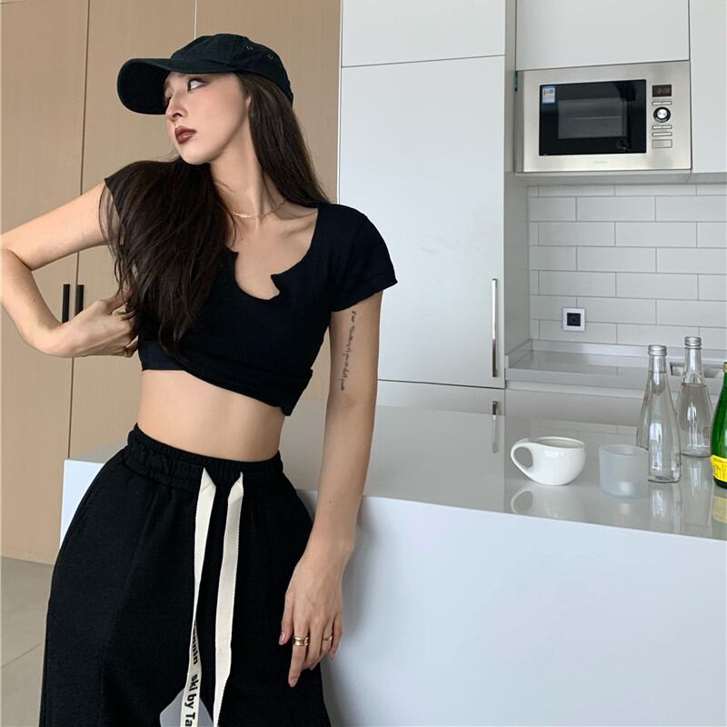 ショートTシャツ スタイルハイウェストウェストVネックサマークロップドソリッド カラートップス 夏物 ソリッドカラー ヨーロピアン 香港の味96415957899