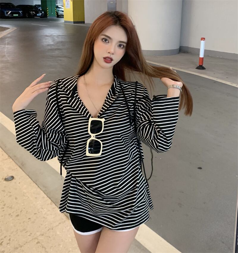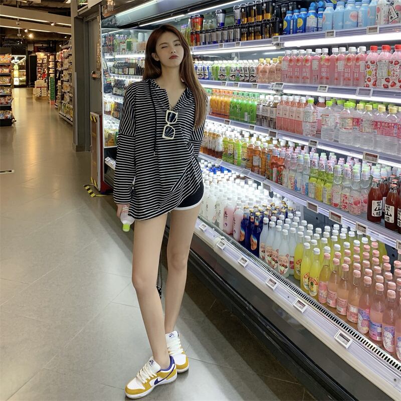 ストライプTシャツ カジュアルサマールーズスタイルカラーフードトップス ロング 夏物 香港の味72128299770