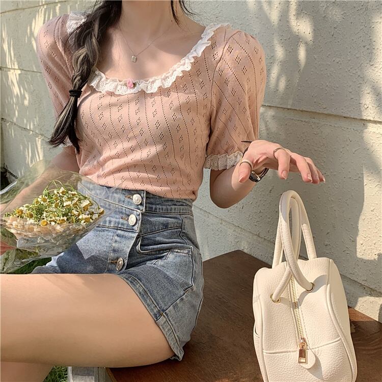 セーター レディースサマー薄手スリーブレーストップス ピンク 大人ガーリー スウィート キュート カジュアル 夏物 シルク 香港の味51483313891