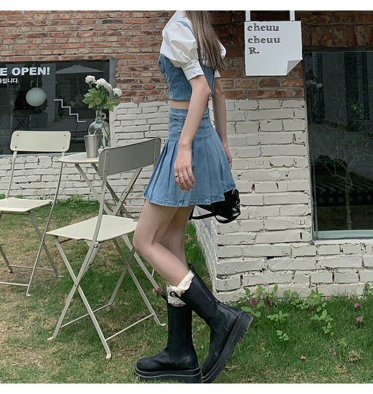 色:フライングスリーブシャツ11118,デニムプリーツスカート9031,デニムスリング9031-1,パフスリーブシャツ560