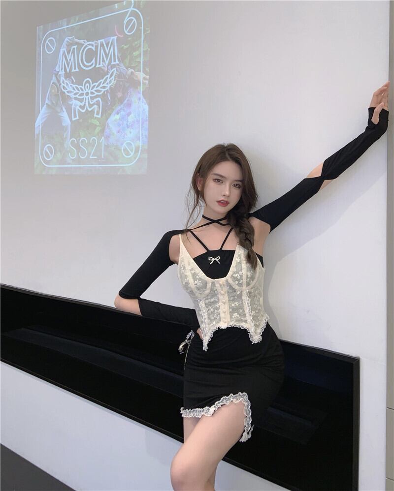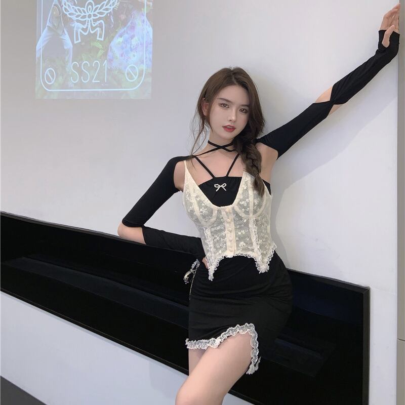 ドレス スタンダードリボンレーススカート サマーブラック レトロ ストリート 夏物 ステッチ 香港の味80221646834