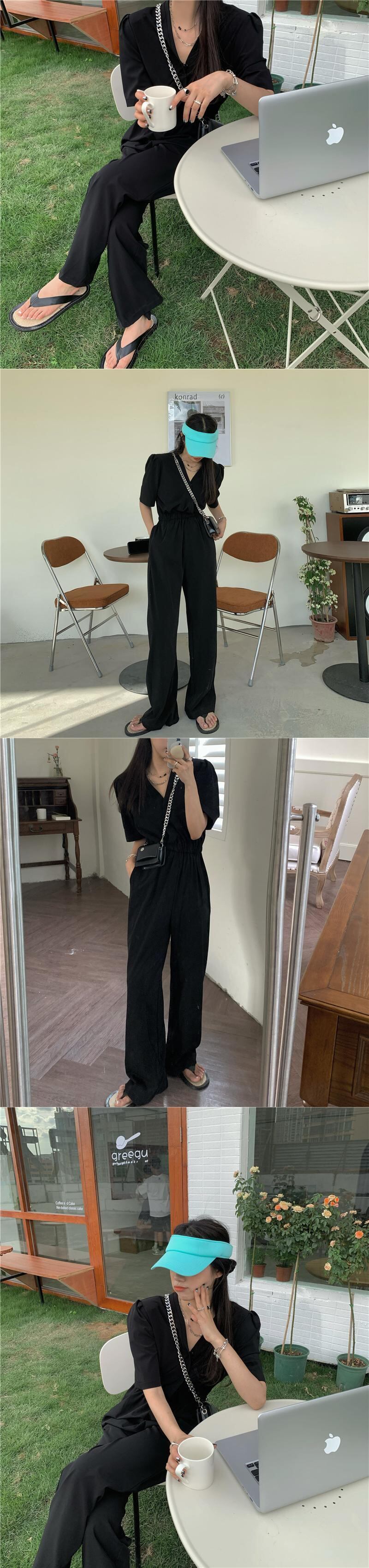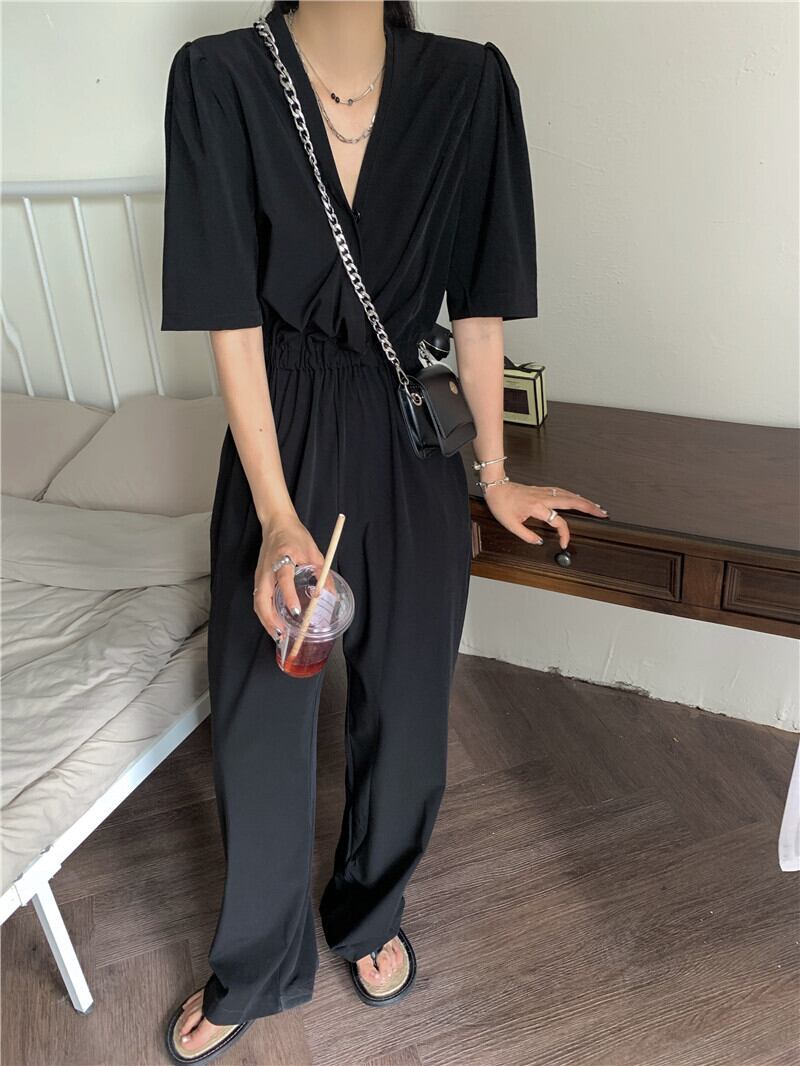 ブラックジャンプスーツ オールインワン サマー薄手Vネックルーズ 夏物 香港の味57369190428