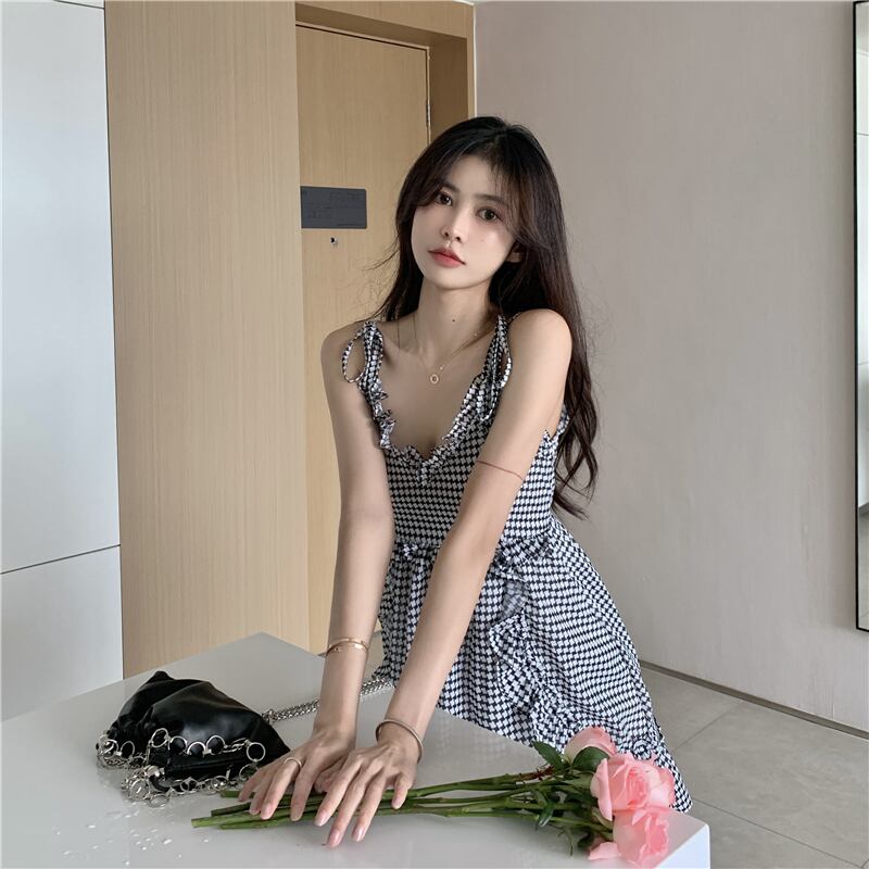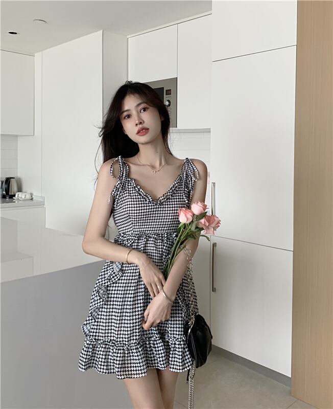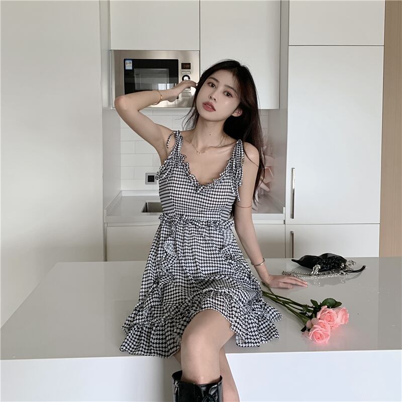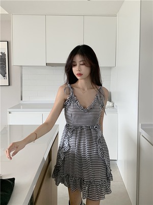 シフォンドレス サマースタンダード格子柄ショートスカート ウェスト薄手 レトロ 夏物 香港の味74994054133