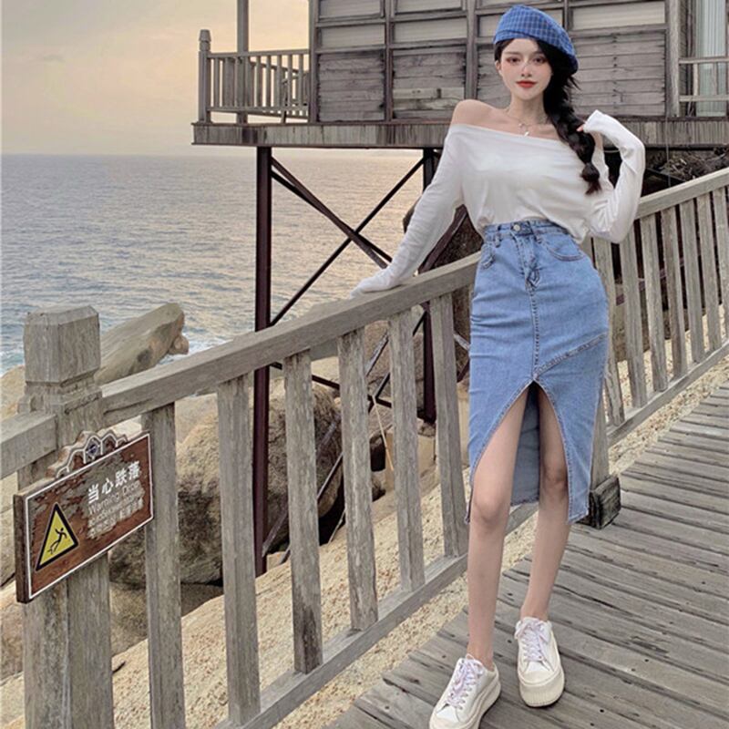 色:デニムスカート,ワンショルダートップ