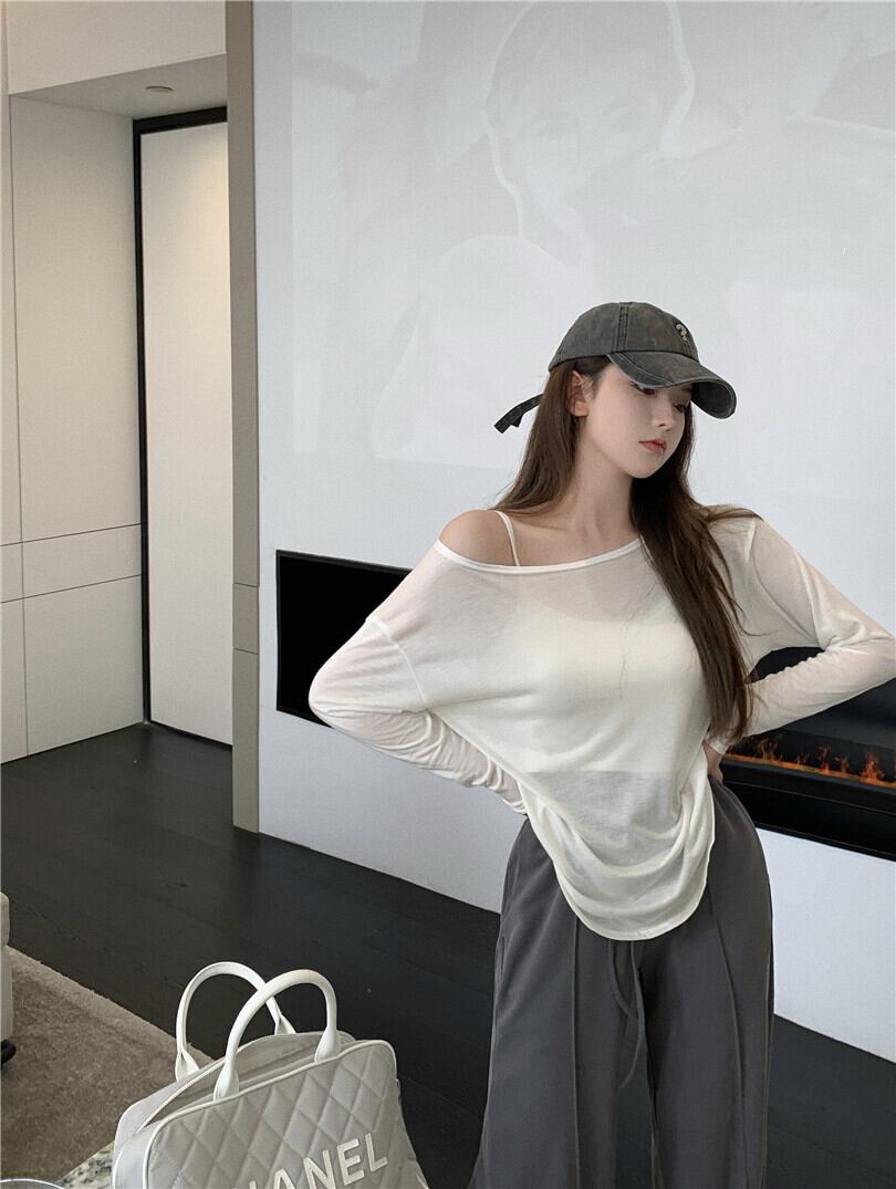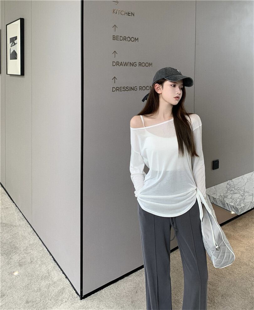 トップス レディース薄手サマールーズショートギャザーストラップレスホワイトTシャツ ロング 夏物 シルク 香港の味83395187690