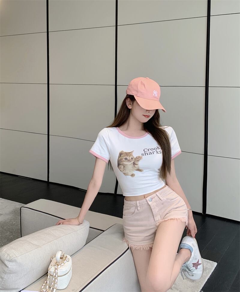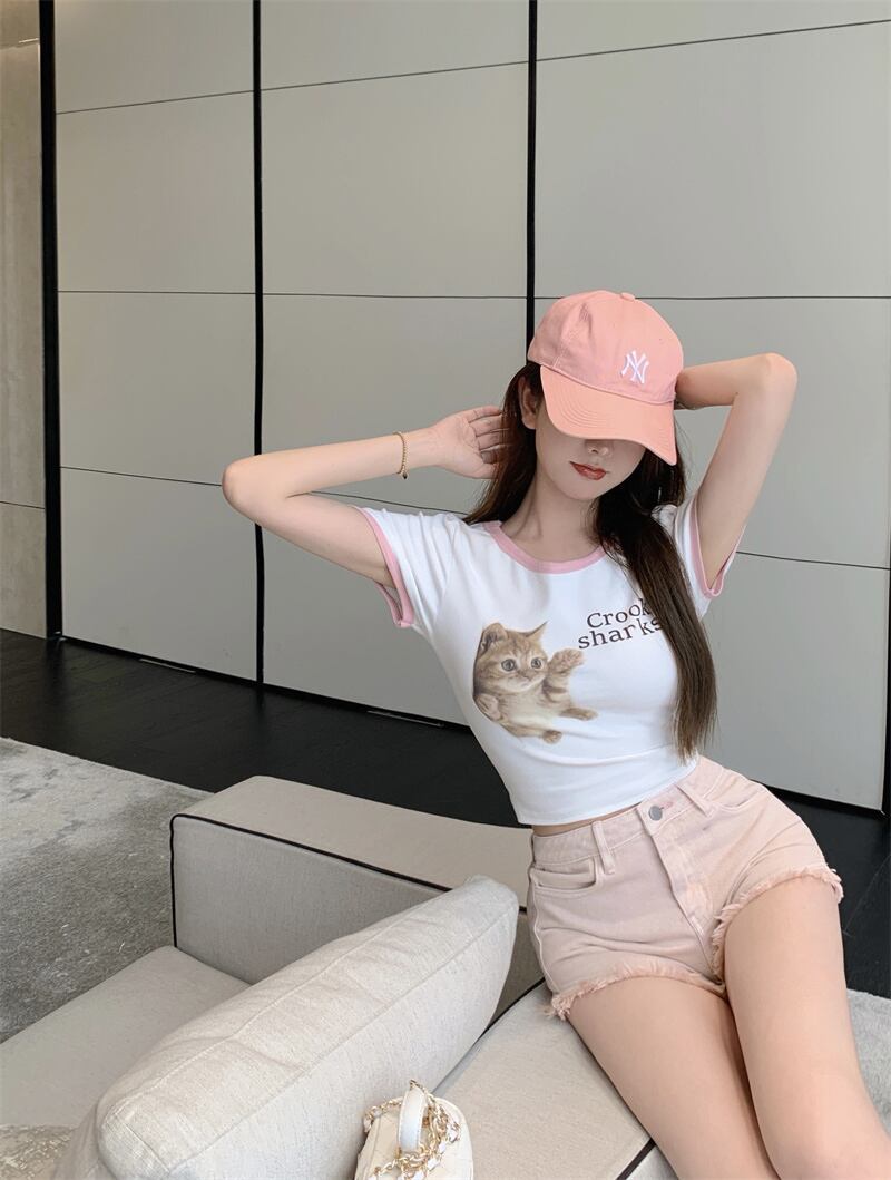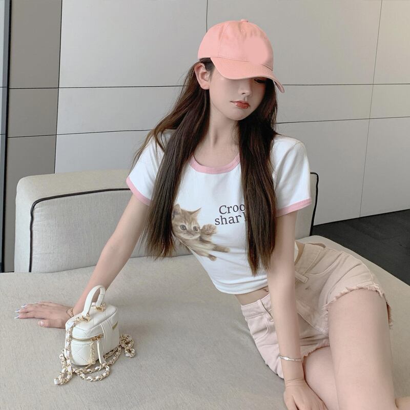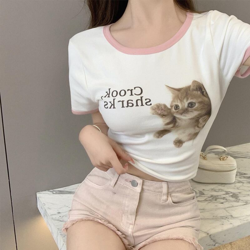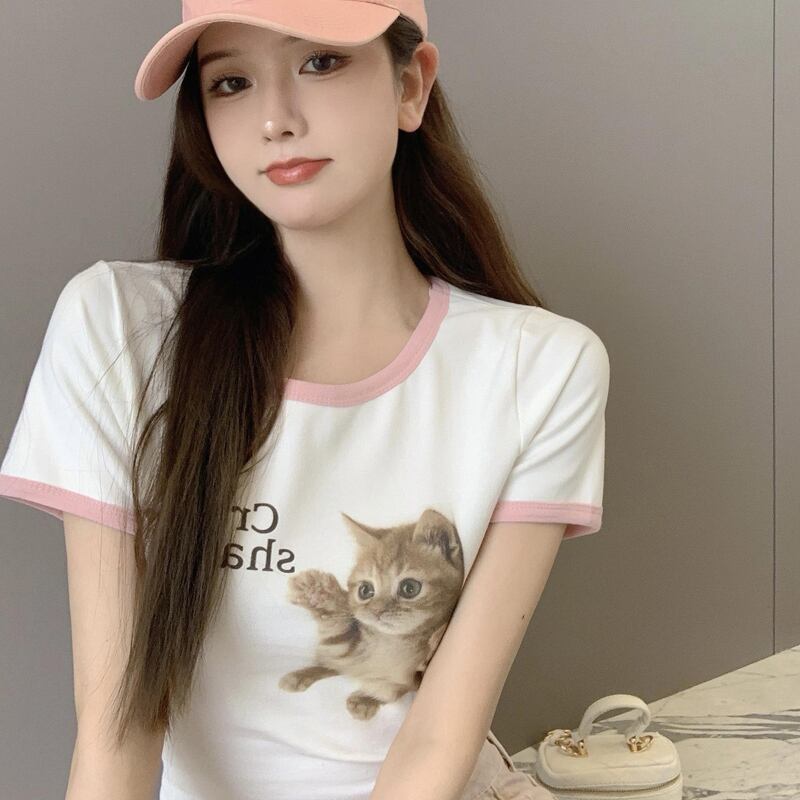 ショートTシャツ サマープリント柄スタンダードカラーラウンドネックホワイトトップス レトロ 大人ガーリー スウィート キュート カジュアル 夏物 Oネック 香港の味62896416970
