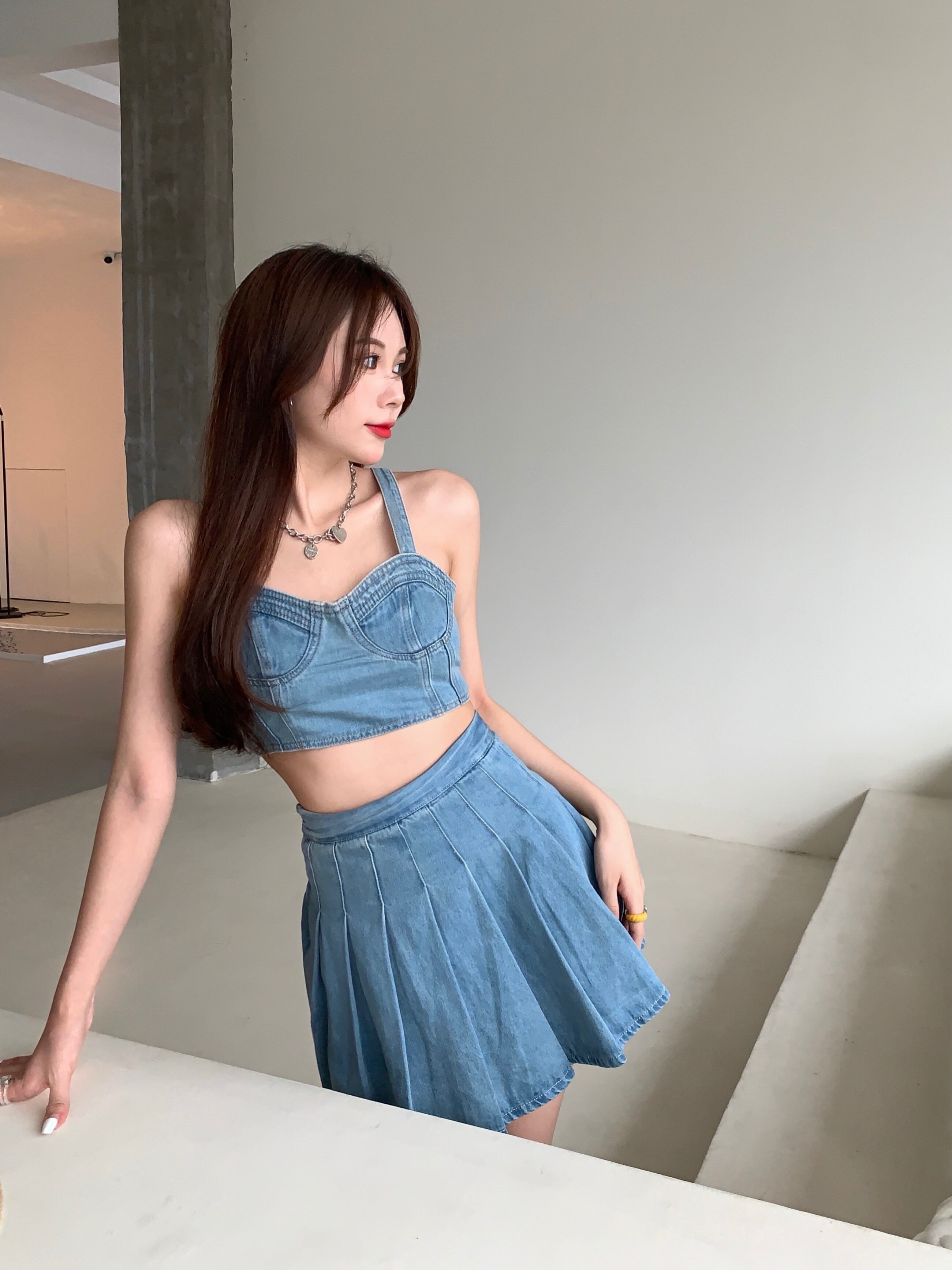 プリーツスカート サマースタンダードハイウェストウェスト薄手Aラインショートブルー レトロ 夏物 香港の味37743348103