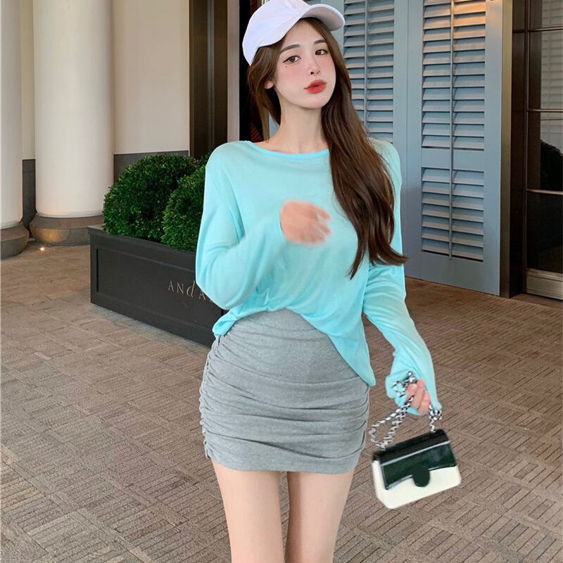 Tシャツ サマー薄手ルーズバックレスブルートップス ロング 夏物 香港の味70270398904