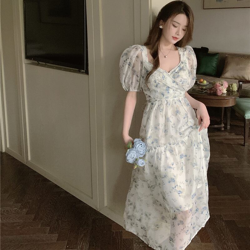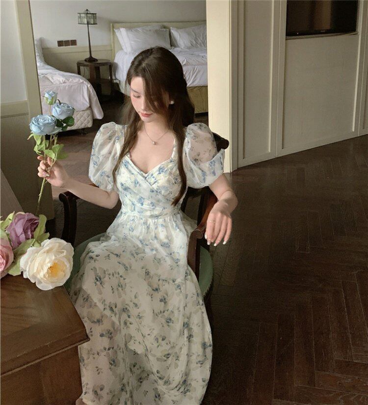 フローラルドレス サマーウェストスカート スリーブロングシフォン 大人ガーリー スウィート キュート カジュアル 夏物 花柄 香港の味39886495044
