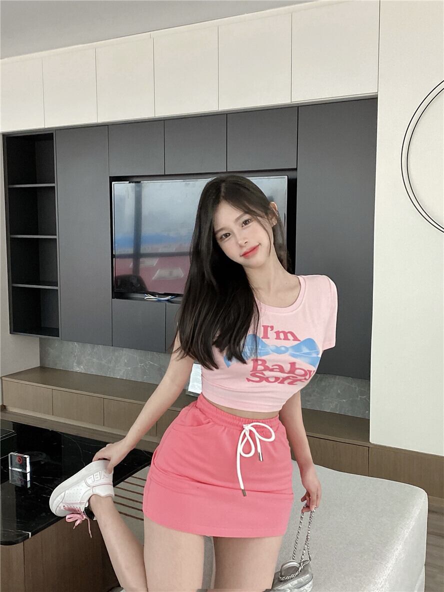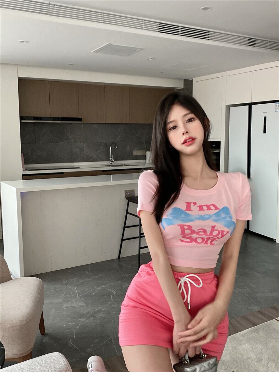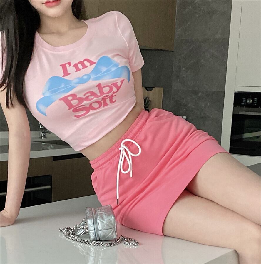 プリントTシャツ サマーラウンドネックショートクロップドスタイルスリム薄手トップス ピンク 大人ガーリー スウィート キュート カジュアル 夏物 Oネック 香港の味43730365152