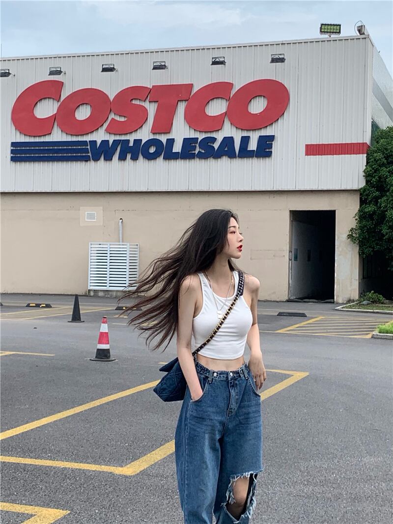 色:ホワイトサスペンダー,ダークブルージーンズ