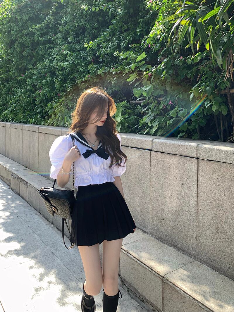 ネイビーカラースリーブショートシャツ ハイウェストウェスト薄手プリーツAラインスカート 香港の味16121181644