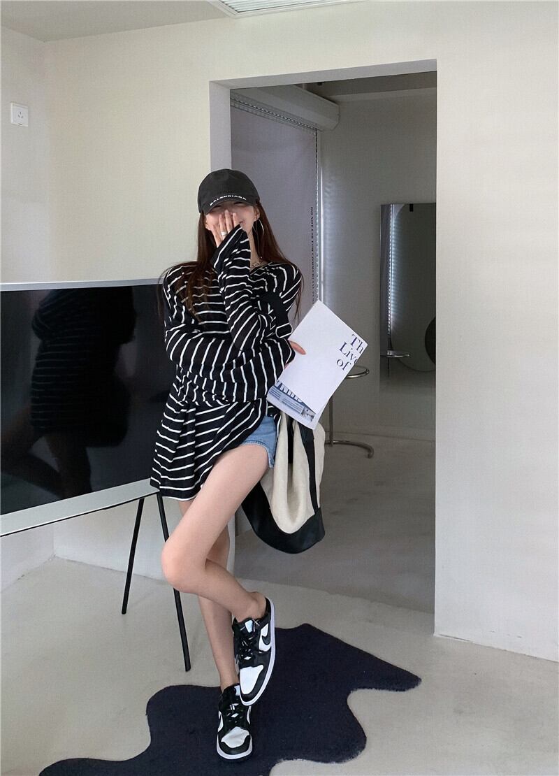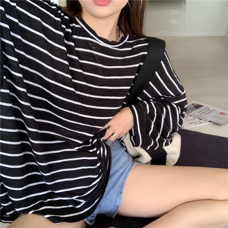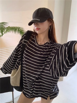 ブラックホワイトストライプTシャツ サマー薄手ルーズカジュアルトップス レディース ロング 夏物 香港の味88510973474