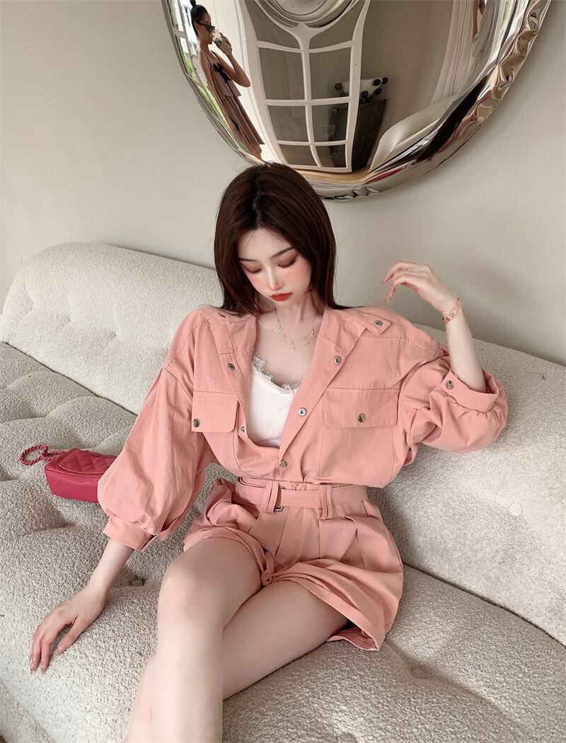 スリーブルーズカーディガントップス サマーハイウェストショーツ ピンク 夏物 ブルマー 香港の味65022430453