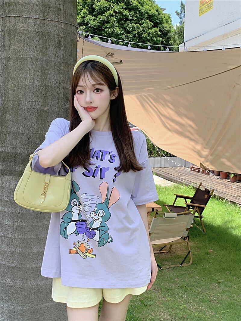 プリントTシャツ サマールーズトップス レディース 大人ガーリー スウィート キュート カジュアル 夏物 パープル 香港の味75396487419