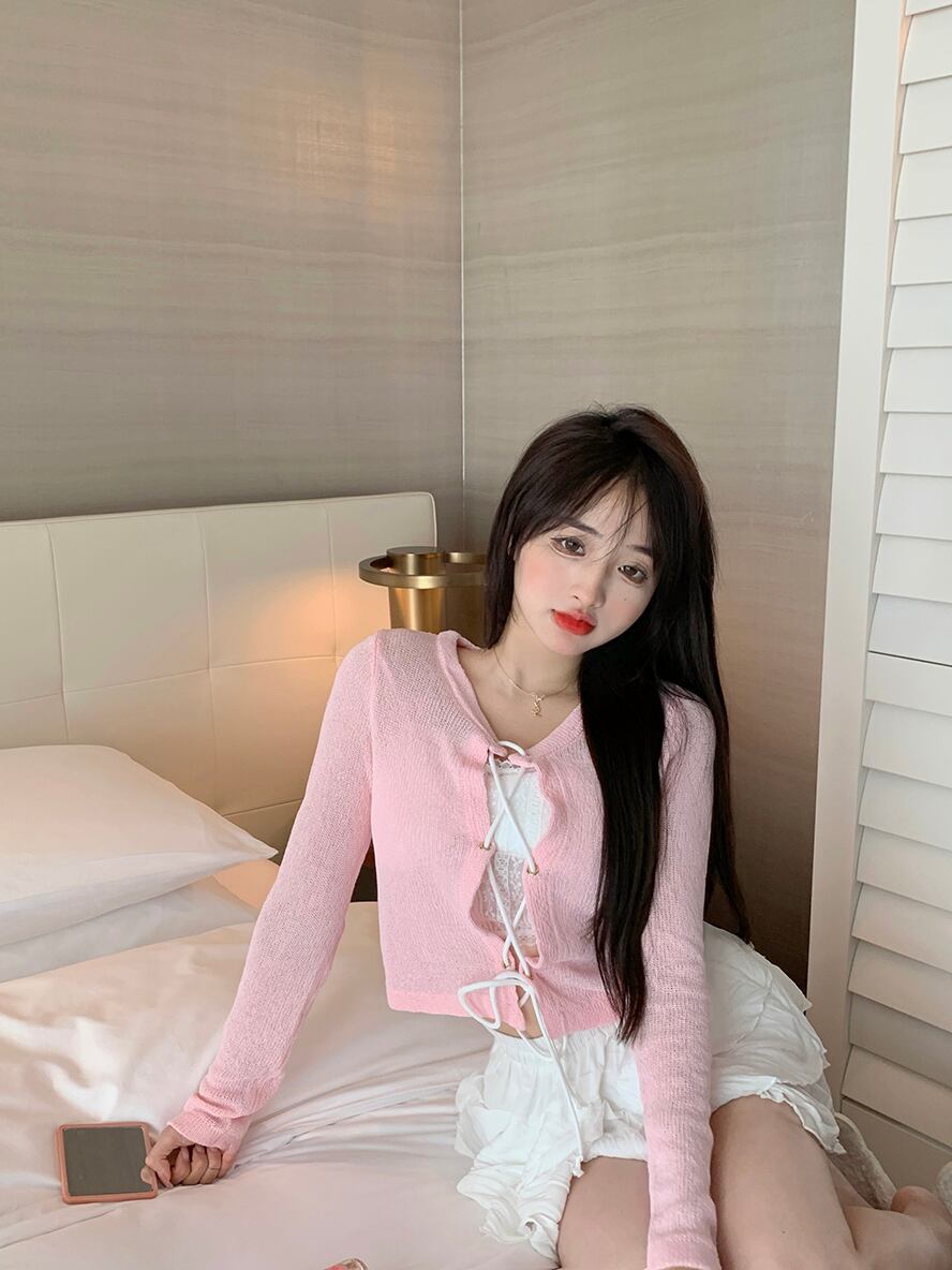 セーター カーディガンサマー薄手スタイルブラウス ロング ピンク 夏物 香港の味22527096365