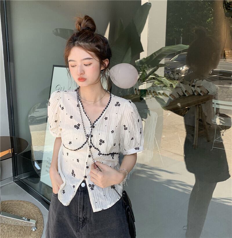 Vネックフローラルスリムショートトップス 大人ガーリー スウィート キュート カジュアル 花柄 香港の味14370626015